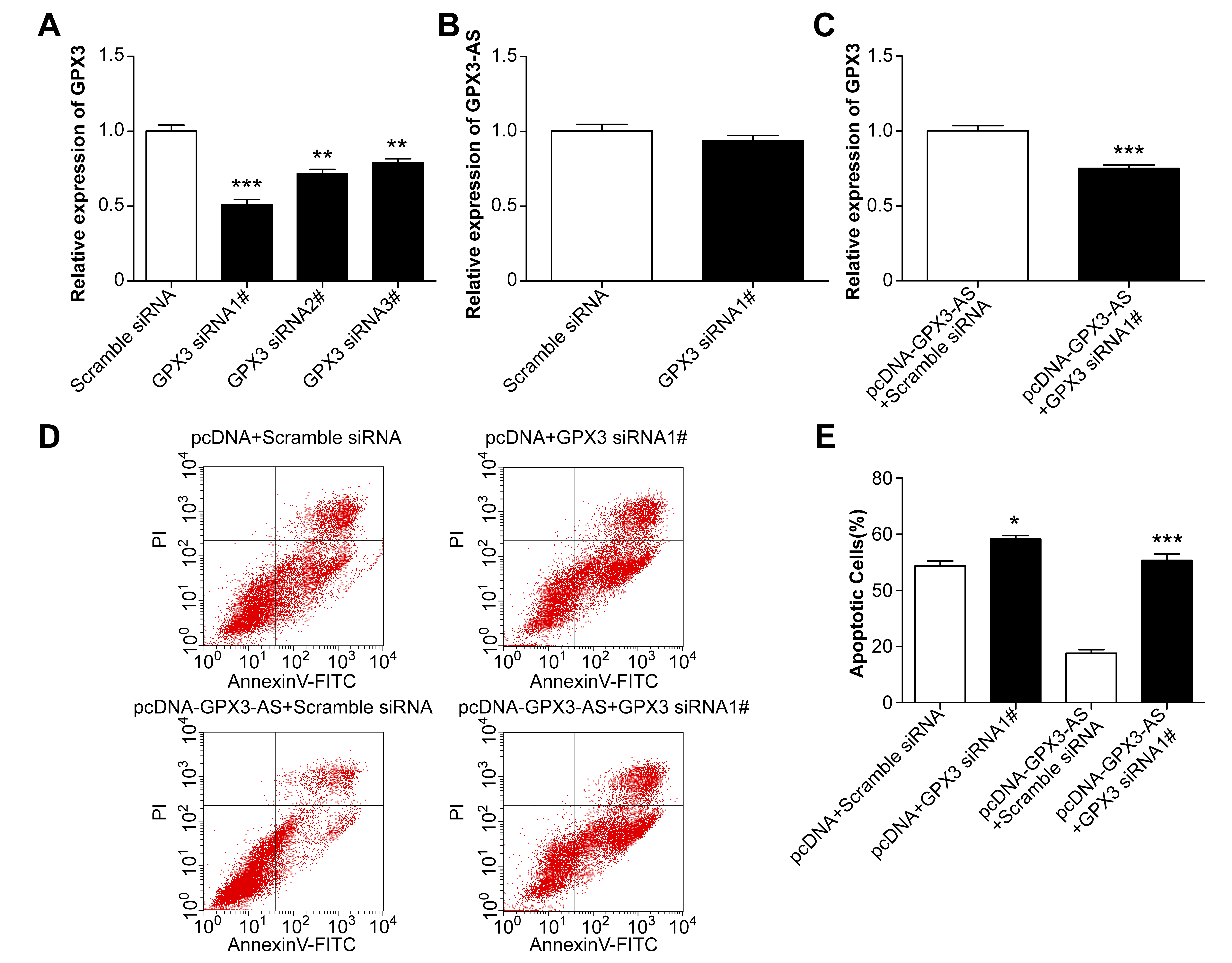 or pcDNA-GPX3-AS plus GPX3 siRNA1 for 24 h, respectively. Then, they were exposed to H2O2 for 24 h. Apoptotic cells were detected by flow cytometry. *p<0.05 versus pcDNA plus scramble siRNA group; ***p<0.001 versus