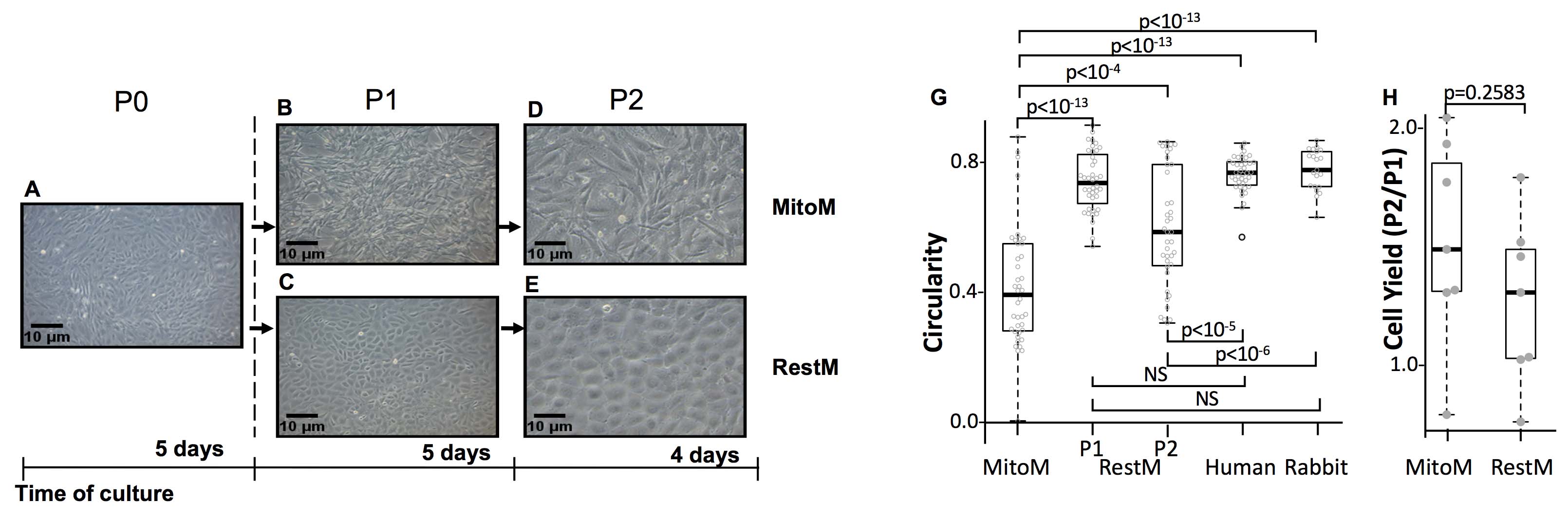 Figure 1. CECs in MitoM and RestM culture conditions. A:Corneal endothelial cells (CECs) in MitoM culture conditions at P0 before the subculture (10X). B: CECs in MitoM at P1 (10X); and (C) CECs in RestM at P1 (10X). D: CECs in MitoM at P2 (10X); and (E) CECs in RestM at P2 (20X). G: Cellular circularity of human, rabbit basal, MitoM, RestM passage 1 (RestM P1), and RestM passage 2 (RestM P2) CECs. H: Cellular yield analysis of CECs obtained after the first passage in MitoM and RestM.