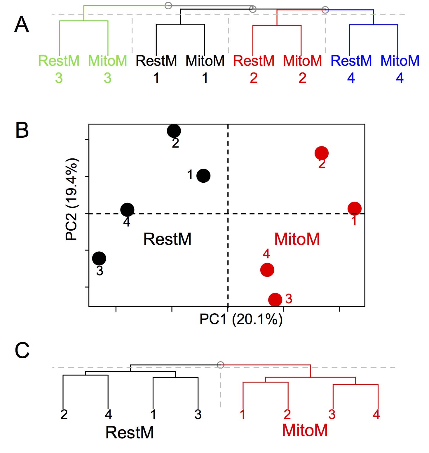 Figure 2. Overall gene expression comparison among the biological replicates 1, 2, 3, and 4. A: Hierarchical clustering comparing all probes in the microarray. B: First and second principal components. The percentage of the total explained variability is shown in the axis labels. PC1