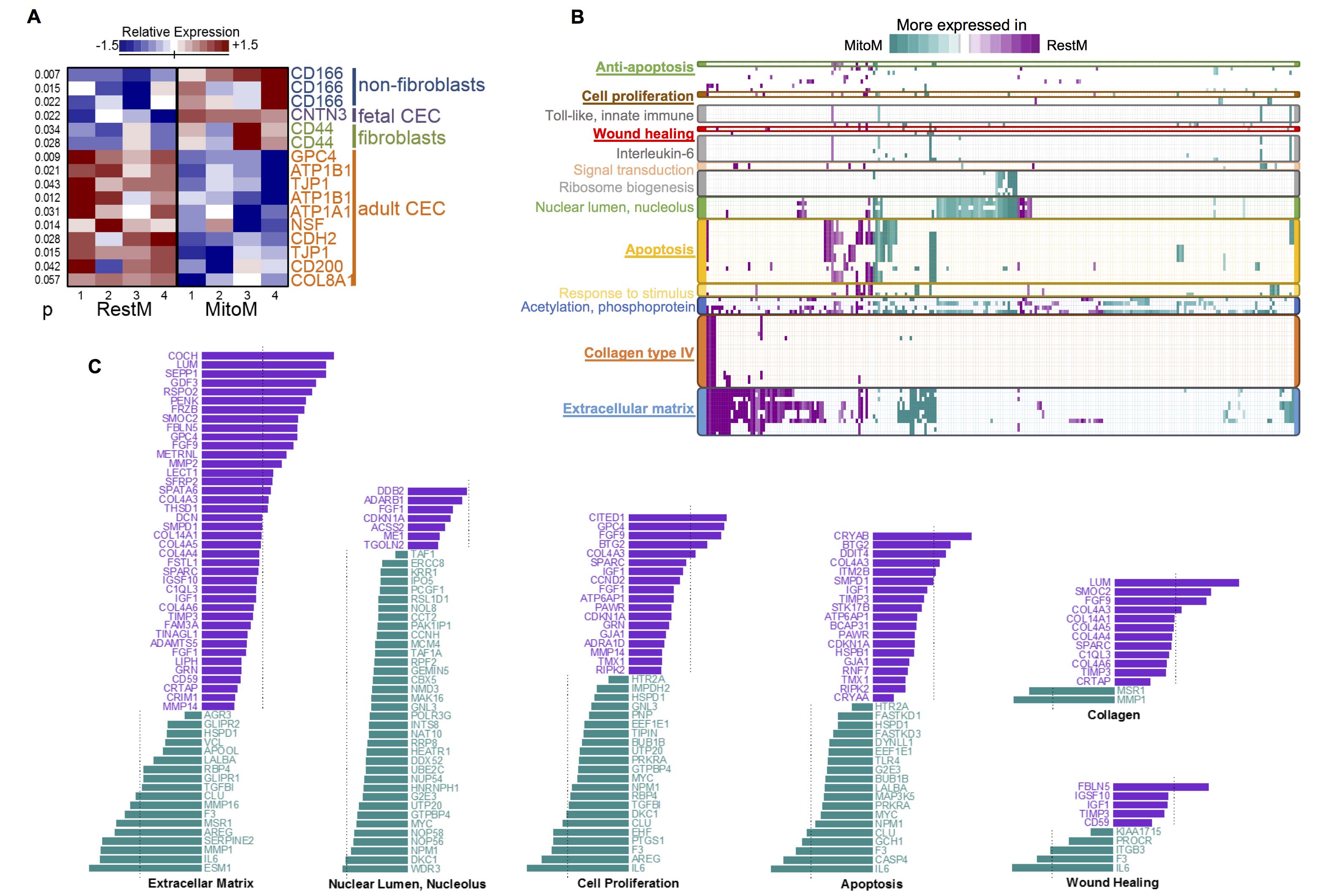 Figure 3. Gene expression comparison and functional analysis. A: Differential expressed corneal endothelial cell (CEC) markers between cells cultured in RestM and MitoM. The molecular markers