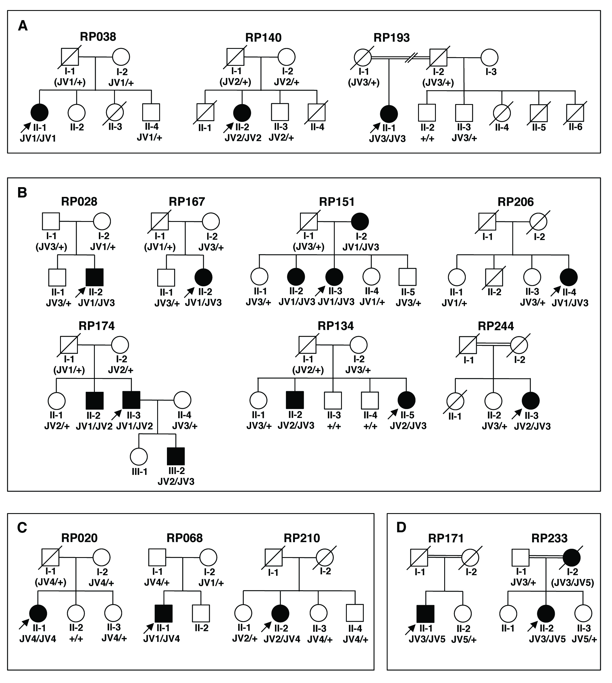 JV5, c.6563T>C (p.(Ile2188Thr)). A: Families carrying homozygous JV1, JV2, or JV3. B: Families carrying compound heterozygous JV3. C: Families carrying JV4. D: Families carrying JV5. A filled symbol indicates an affected individual. An arrow indicates a proband in the family. Genotype