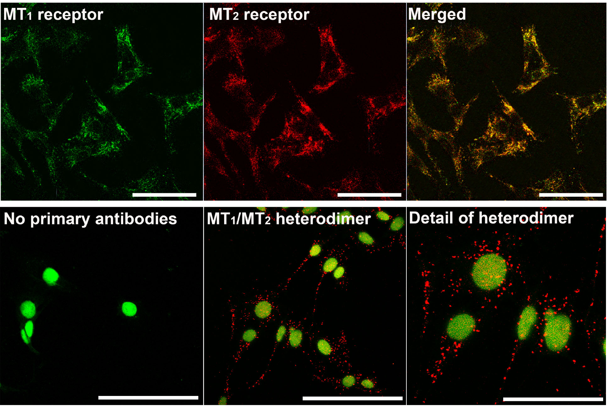 Figure 1. MT1 and MT2 form heterodimers in 661W cells. Upper panels: Immunofluorescence for melatonin receptor type 1 (MT1) and MT2 receptors and colocalization. Scale bars = 100 µm. Lower panels: Proximity ligation assay (PLA) showing the MT1/MT2 interaction (positive signal shown as red dots in the right panel). Cell nuclei are shown in green. Scale bars: left and