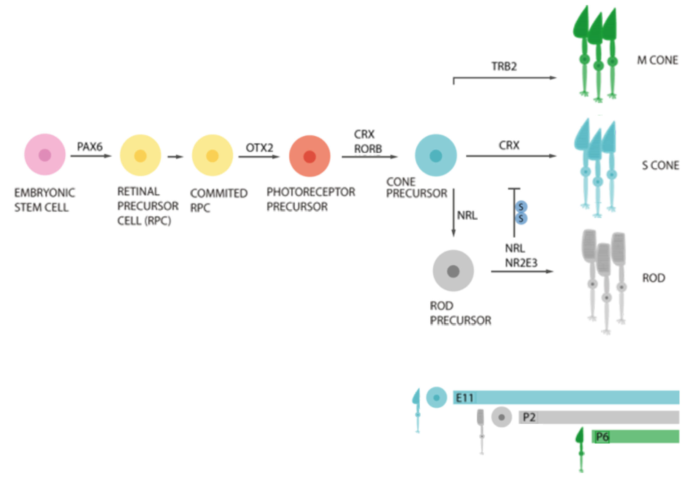 Figure 1. Diagram of murine photoreceptor development with key regulatory transcription factors. From embryonic stems cells, several