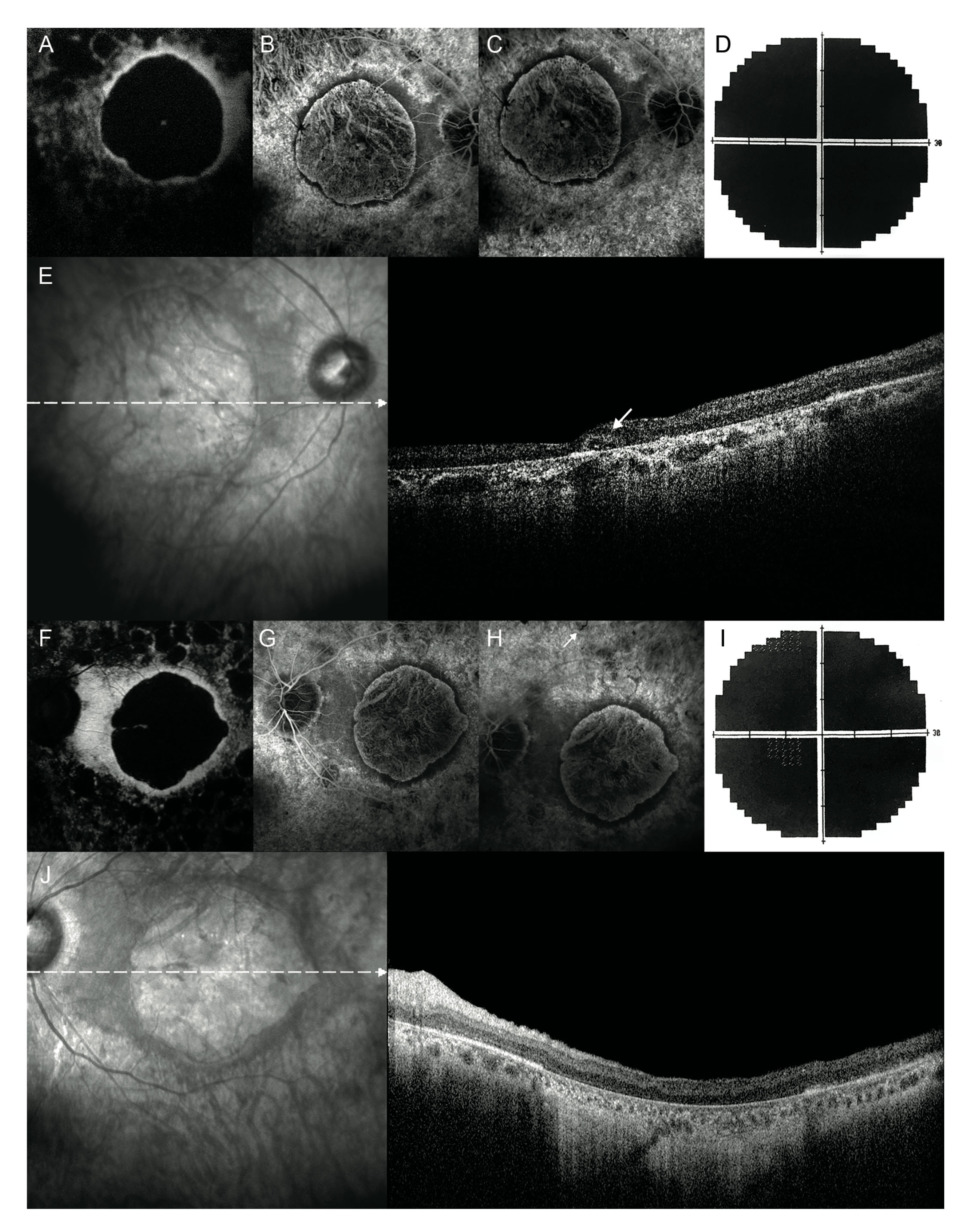 areas of reduced autofluorescence, suggestive of patchy atrophy, can be seen. B, C, G, H: In both eyes, fluorescein angiography frames reveal a severe macular atrophy surrounded by a ring of preserved retinal pigment