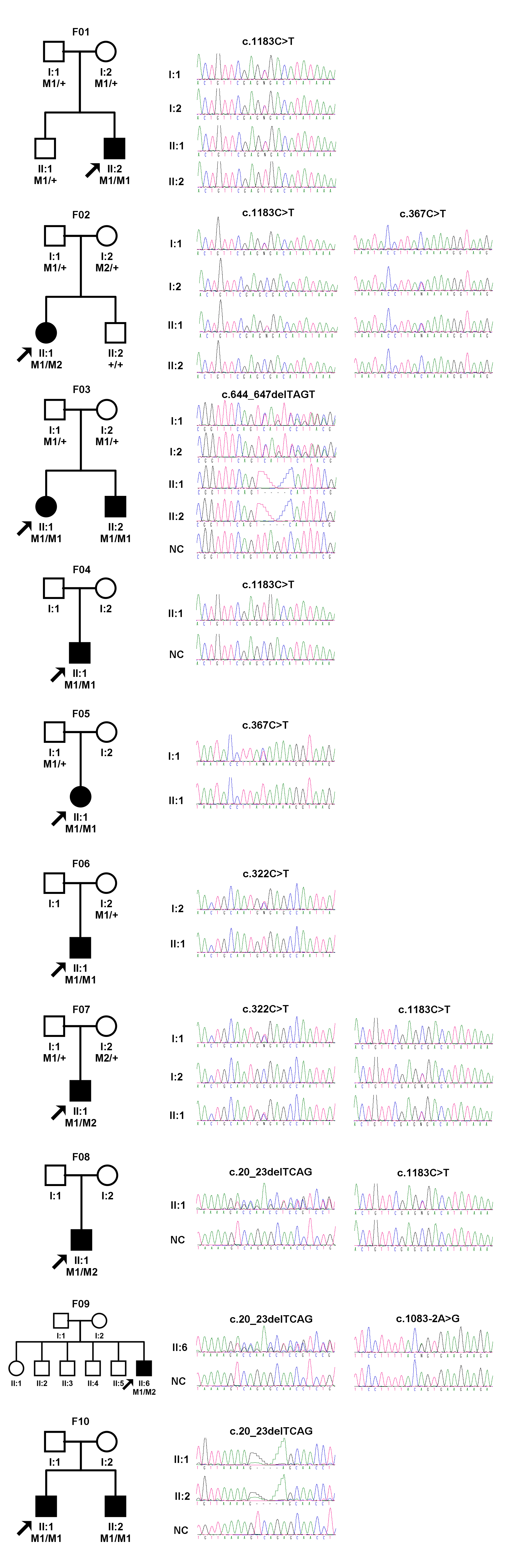 To access the data, click or select the words “Appendix 1.” Chromatography of nucleotide sequence variations determined by Sanger sequencing. Pedigrees and individual numbers are shown on the left side, and the corresponding sequence variations are presented on the right side.