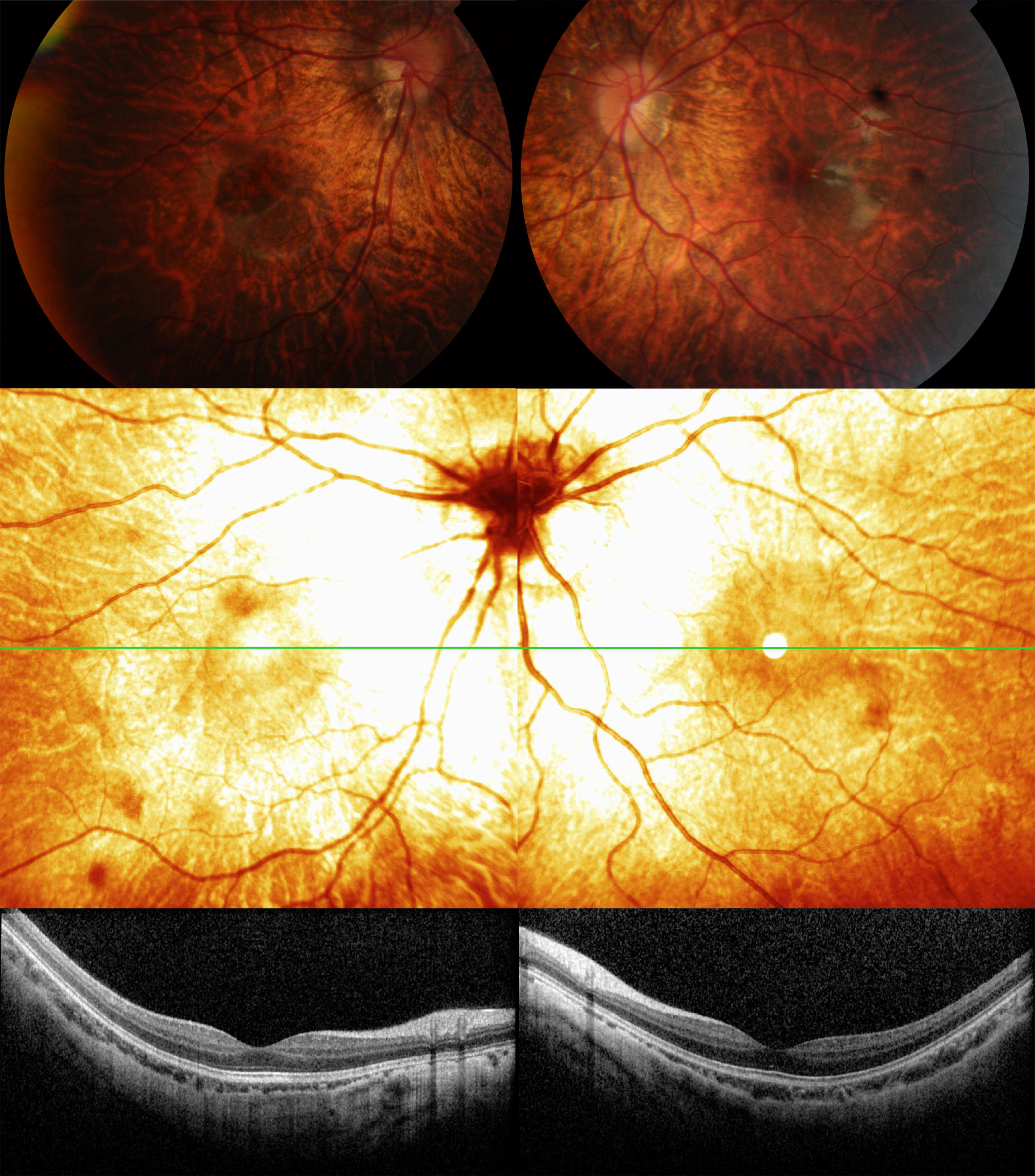 Figure 2. Multimodal retinal imaging findings in TRPM1-associated CSNB in patient 2 with the novel homozygous missense c.1394T>A (p.Met465Lys) mutation. Top row: Color fundus of patient 2 right and left fundi. Middle row: Location of the optical coherence tomography line scan on the fundus en face image. Bottom row: Transfoveal single line optical coherence tomography scans of the right and left eyes of patient 2 demonstrating preserved