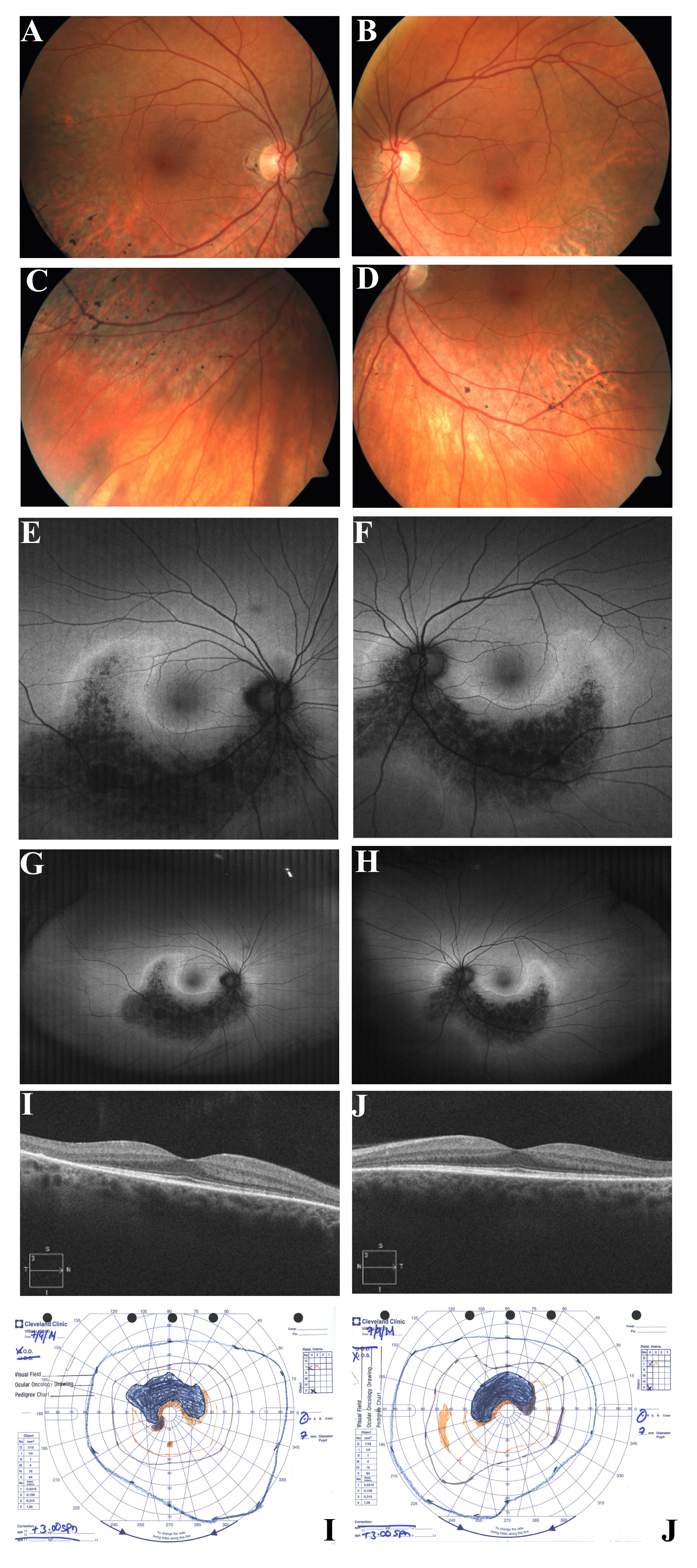 Figure 4. Clinical imagining of patient 4 with a c.808A>C mutation in RHO (p.Ser270Arg). A, C: Ocular dexter (OD) color photo of posterior pole showing RPE hypopigmentation and atrophic changes with occasional bone