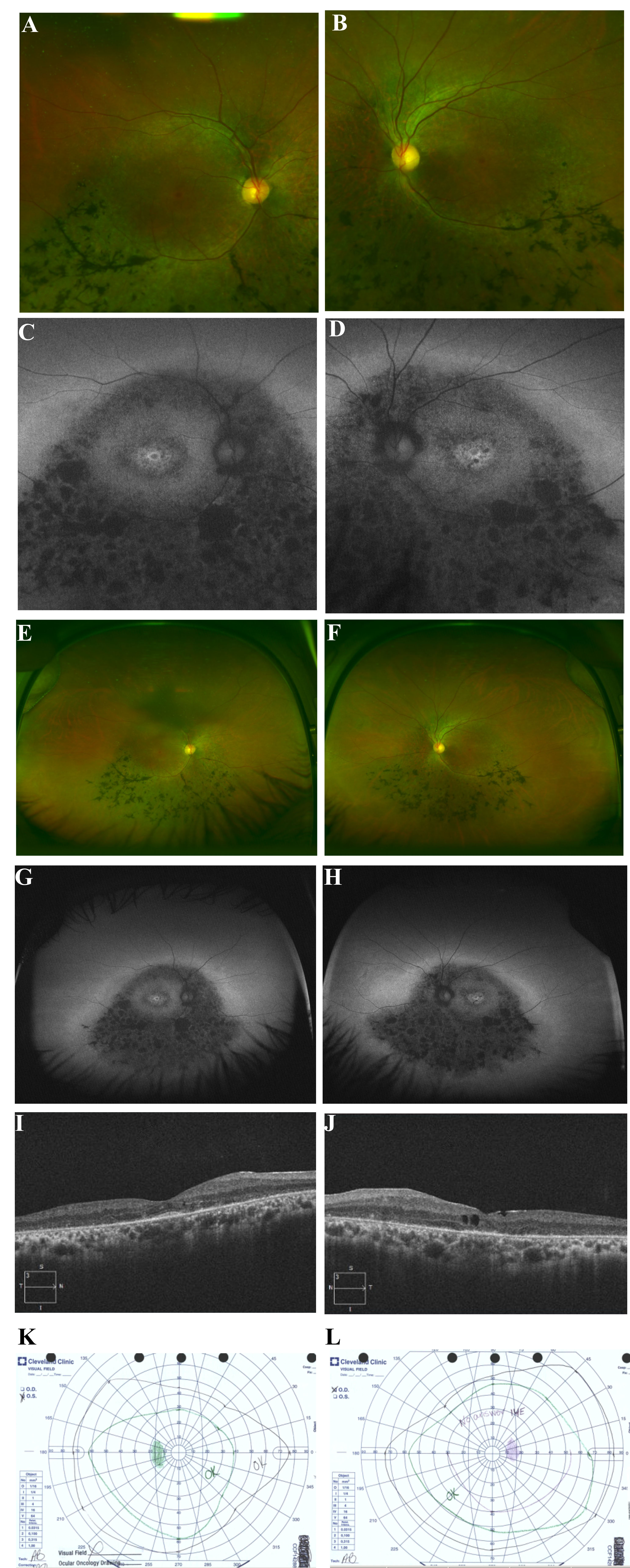 Figure 7. Clinical imagining of patient 7 with a c.44A>G mutation in RHO (p.Asn15Ser). A, E: Oculus dexter (OD) color photos showing a concentric foveal hypopigmentation, marked parafoveal RPE mottling and hypopigmentation,