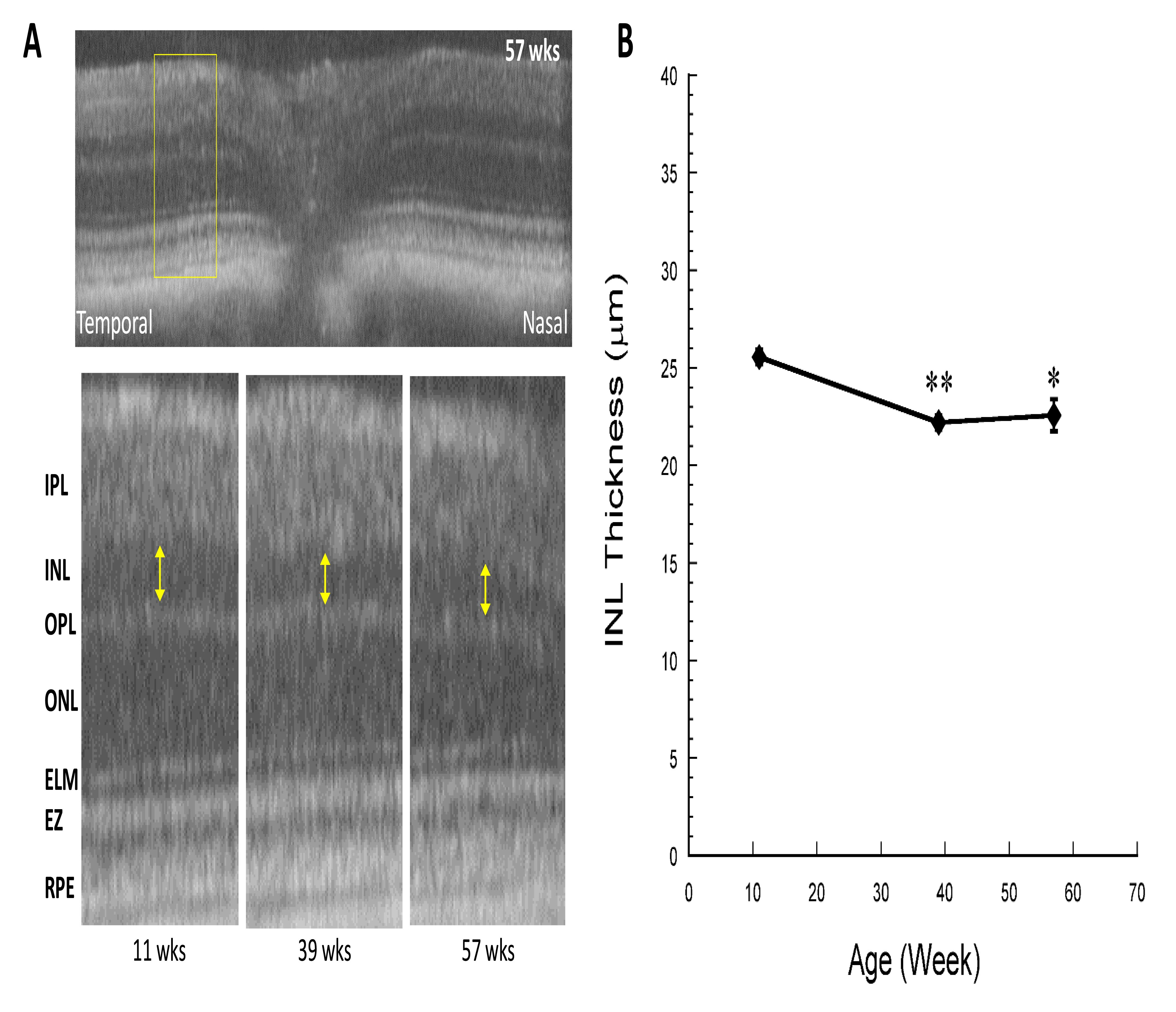 layer; ONL, outer nuclear layer; OPL, outer plexiform layer; RPE, retinal pigment epithelium. B: Thickness of the INL at 11, 39, and 57 weeks of age. The INL was thicker at 11 weeks of age, compared to the older ages