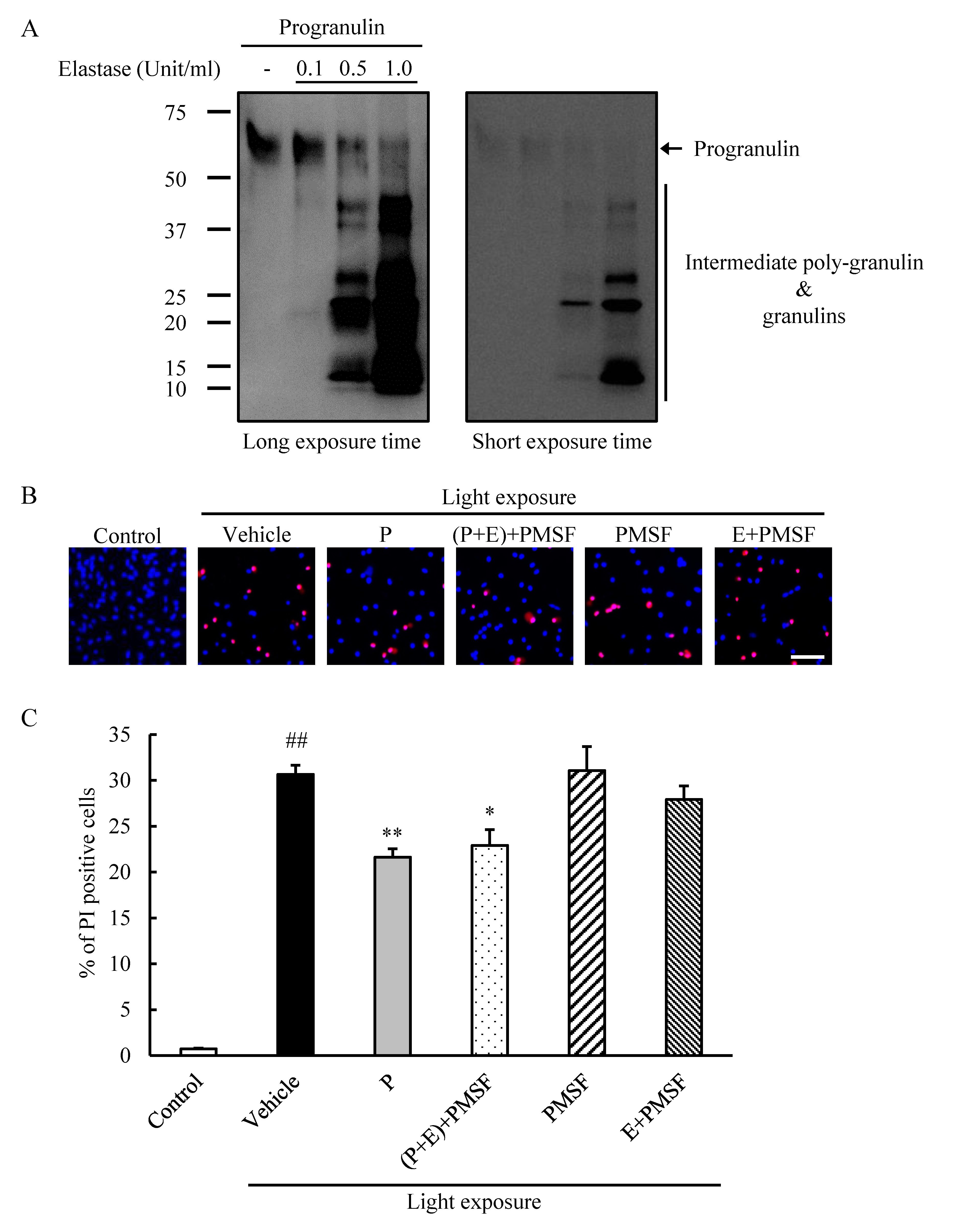 right images were detected with long and short exposure times, respectively. B: Representative images of cone photoreceptor cells (661W) stained with Hoechst 33,342 and propidium iodide (PI). C: 661W cells were incubated under light exposure. PBS, PGRN, cleaved PGRN ([P + E] + phenylmethylsulfonyl fluoride [PMSF]),