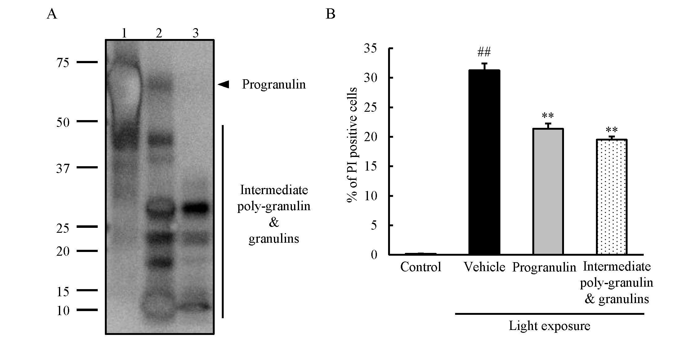 (lane 1 recombinant PGRN, lane 2 cleaved PGRN, lane 3 intermediate poly-granulins and granulins). An arrowhead marks the full-length PGRN. B: Full-length PGRN and granulins with intermediate poly-granulins rescued the cell death induced by light exposure. Data are
