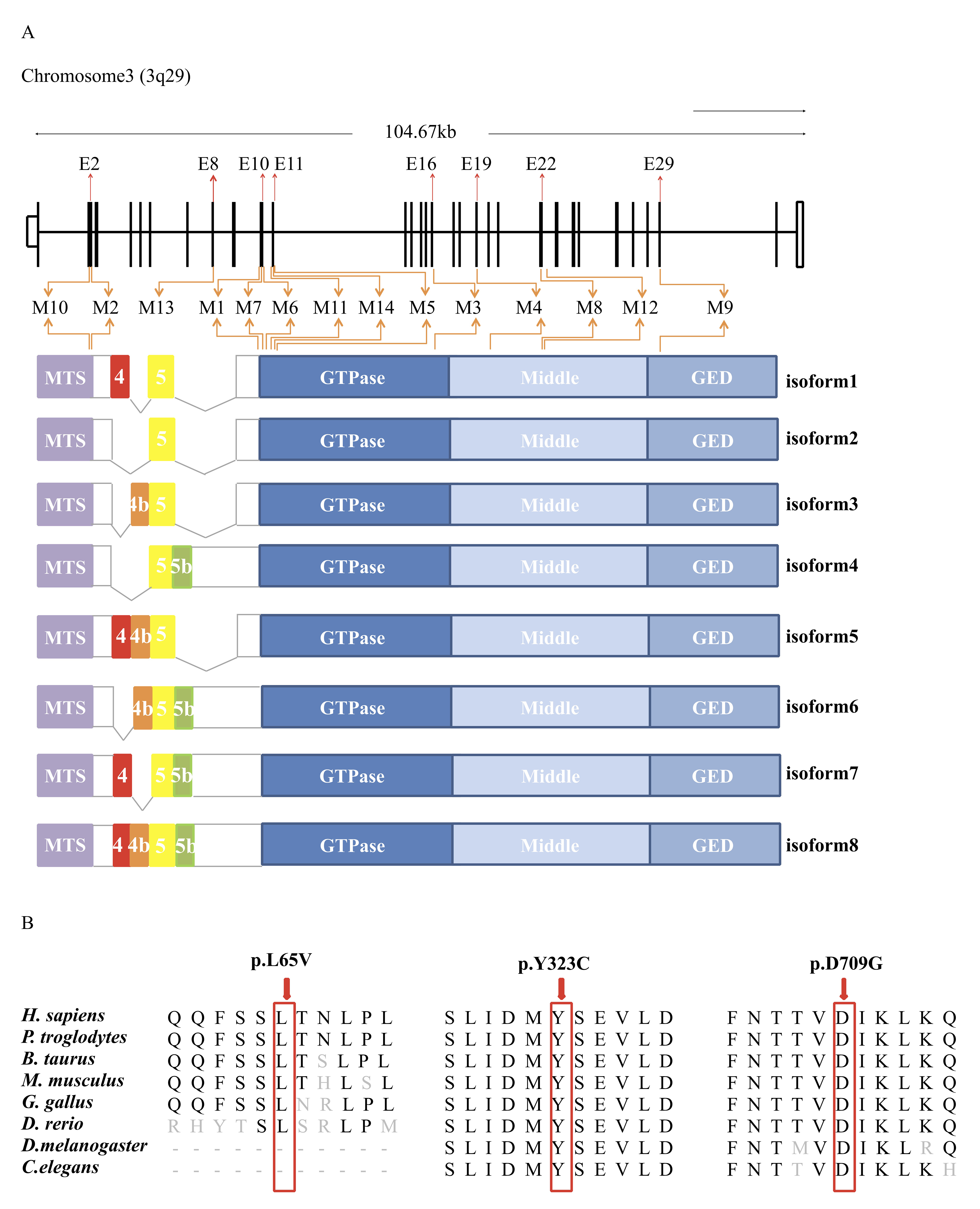 mitochondria-targeting sequence (MTS), a GTPase domain, a middle domain, and a C-terminus GTPase effector domain (GED). B: Orthologous protein sequence alignment of OPA1 from human (H. sapiens), chimpanzees (P. troglodytes), cows (B. taurus), rats (M. musculus), chickens (G. gallus), zebrafish (D. rerio), fruit flies (D. melanogaster), and roundworms (C. elegans).