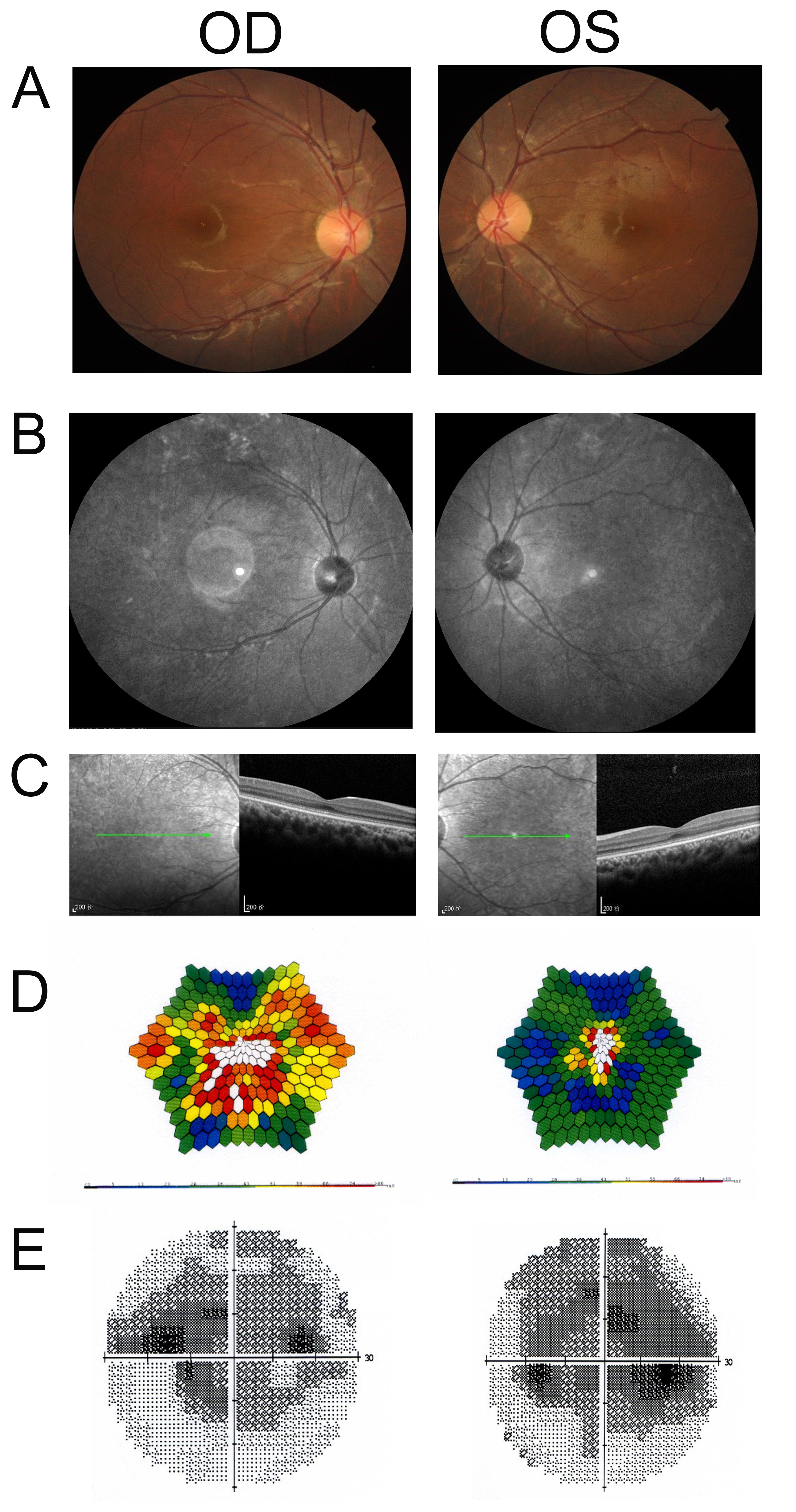 fundus photography. C: The macular optical coherence tomography (OCT) examination shows that the band imaging of both eyes is slightly blurred.