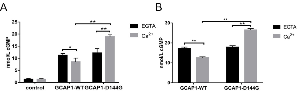 measured in the presence of GCAP1-WT/D144G. The free Ca2+ concentration is 2.5 μM. The mock-transfected group was used as control. B: The levels of cGMP stimulated by transfected retGC1 in the HEK-293 cells were regulated by purification of GCAP1-WT/D144G.