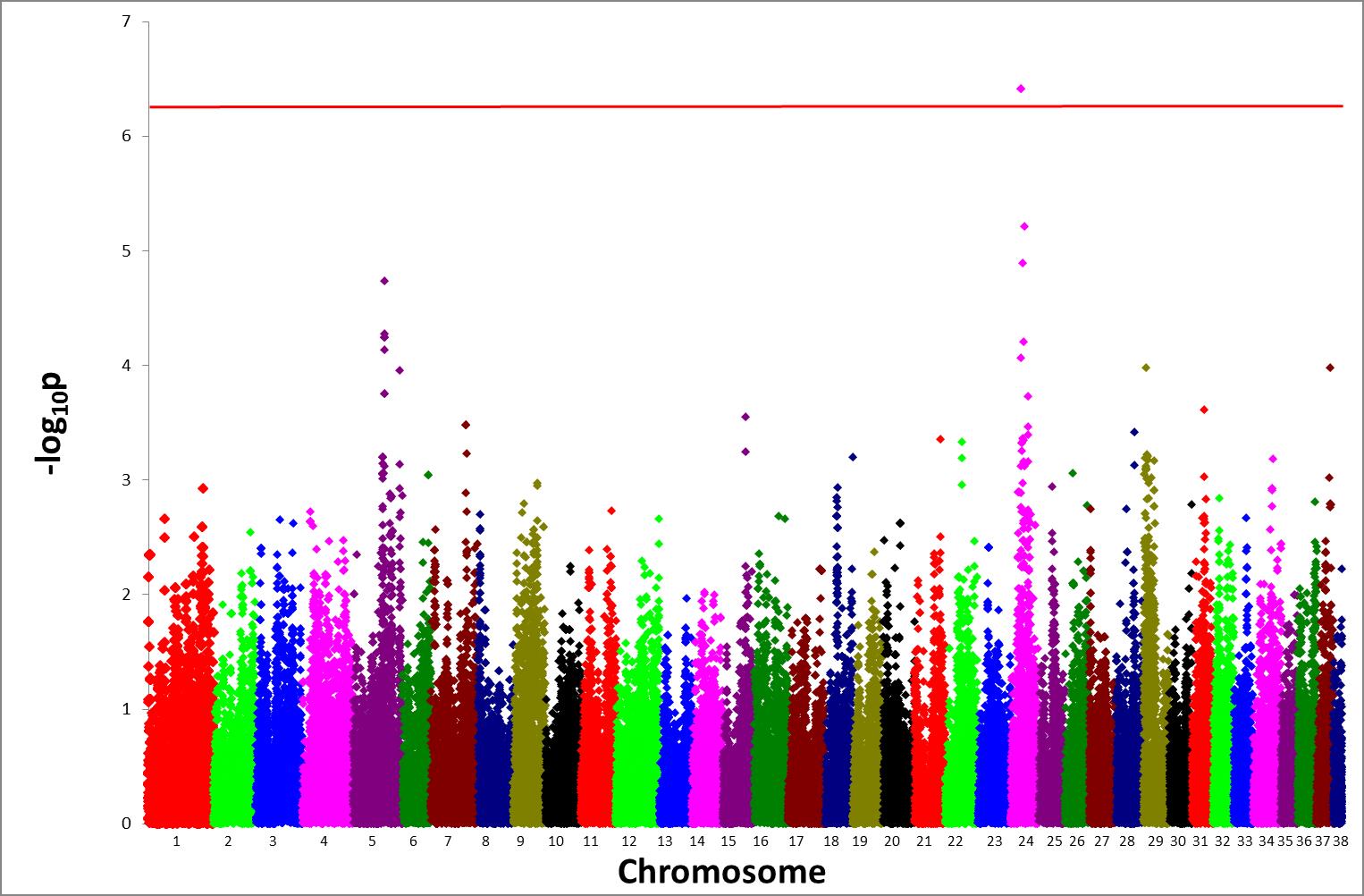 Manhattan plot for GWAS Analysis 4 (Cases: PCAG cases; Controls: PLA cases) in the European BH. The horizontal red line denotes the threshold for genome-wide statistical association.