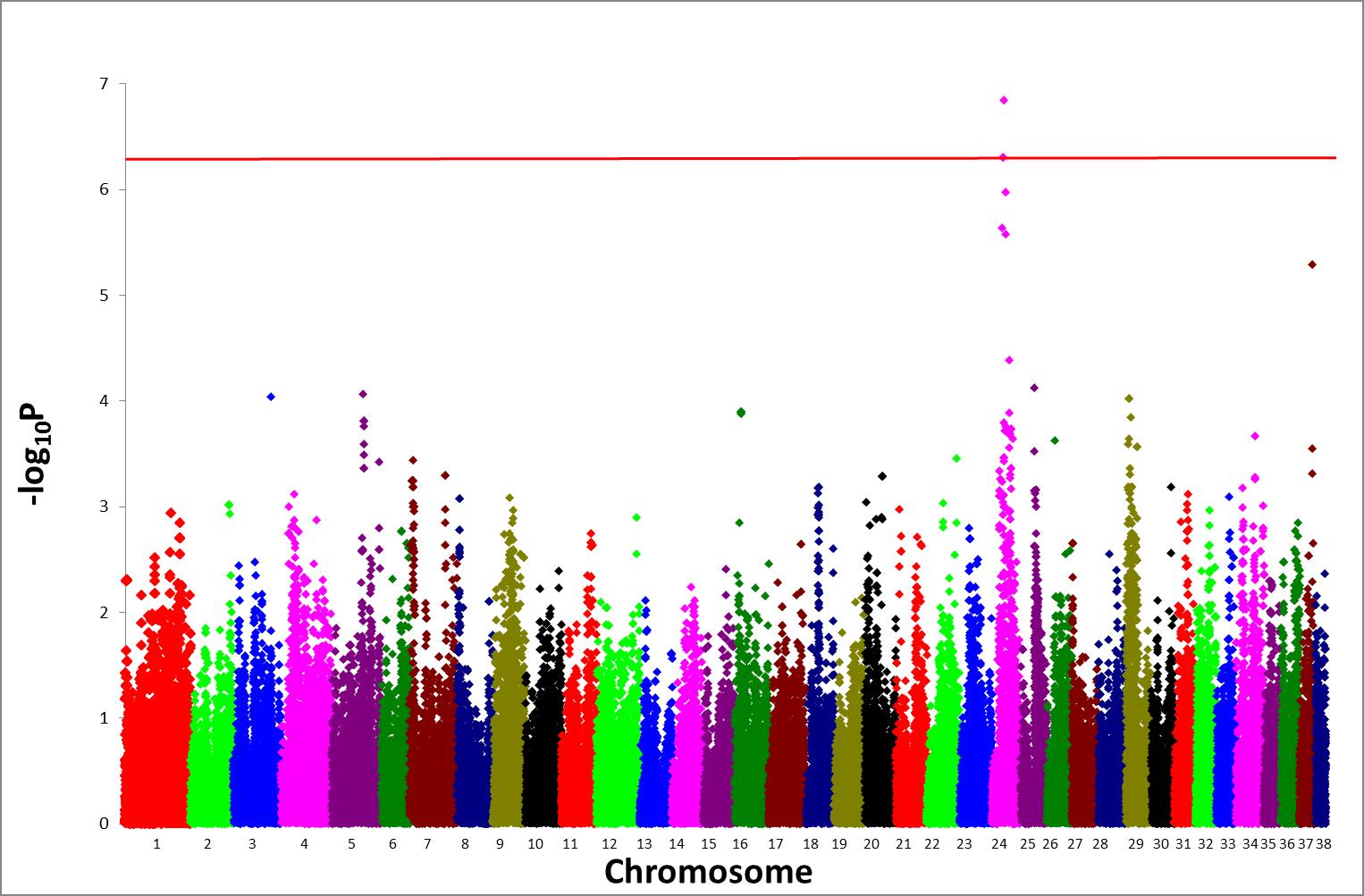 Manhattan plot for GWAS Analysis 5 (Cases: PCAG cases; Controls: PLA cases and control dogs) in the European BH. The horizontal red line denotes the threshold for genome-wide statistical association.