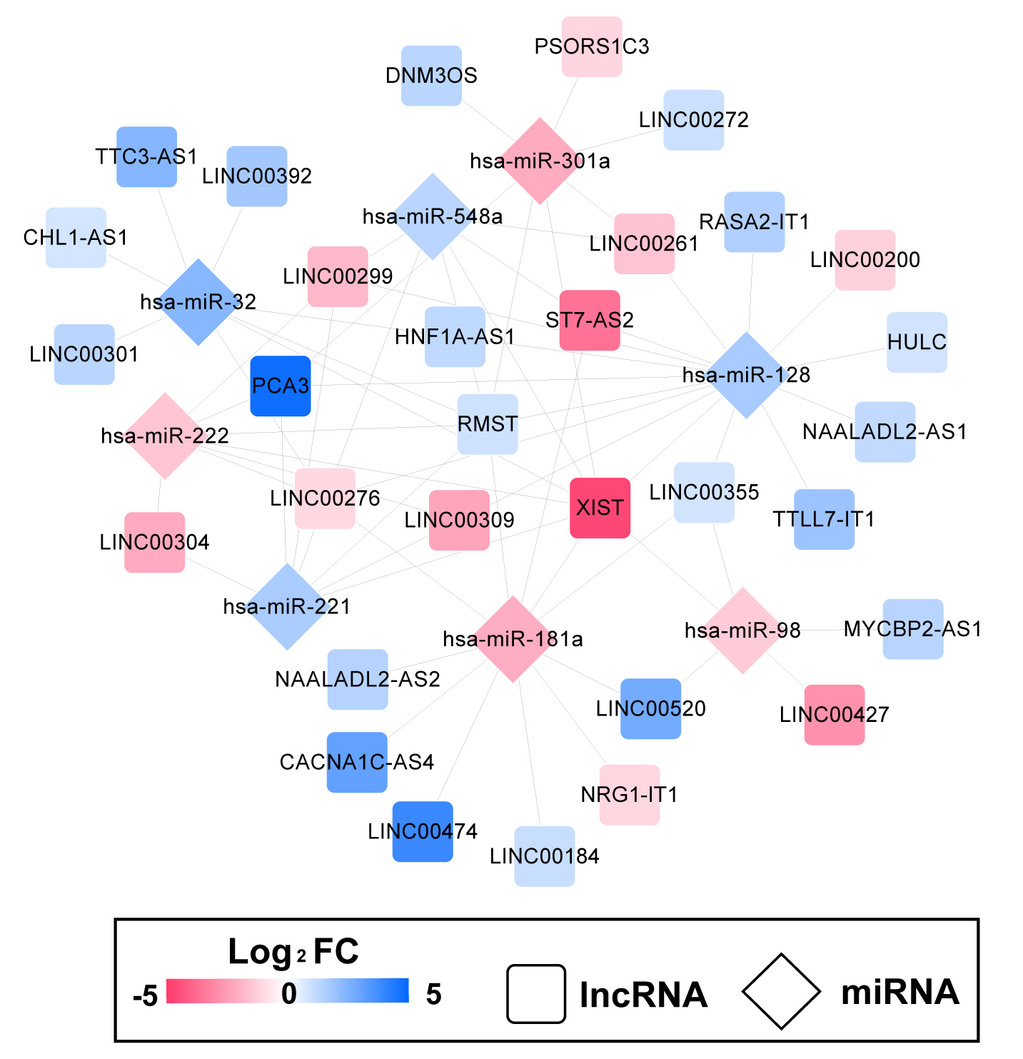 The long non-coding RNA (lncRNA)–microRNA (miRNA) regulatory network. The squares and diamonds represent lncRNAs and miRNAs, respectively. Blue and red represent upregulation and downregulation, respectively.