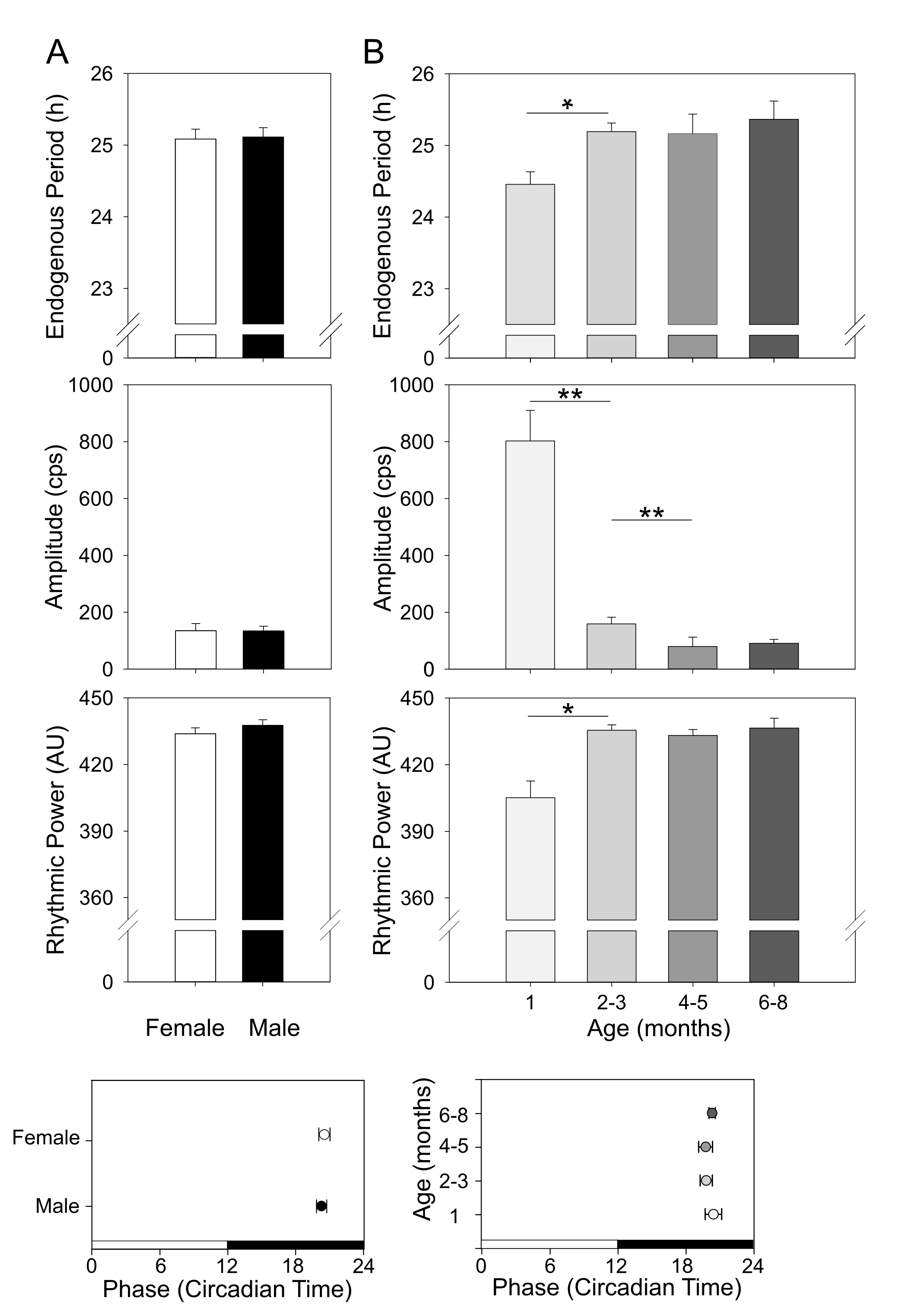 power are calculated at 3 days baseline in retinal explants from A: 2-month-old male and female Per2Luc mice and B: male and female Per2Luc mice divided into four groups and aged 1 month, 2–3 months, 4–5 months, or 6–8 months. Bars represent mean ± SEM n = 12 for