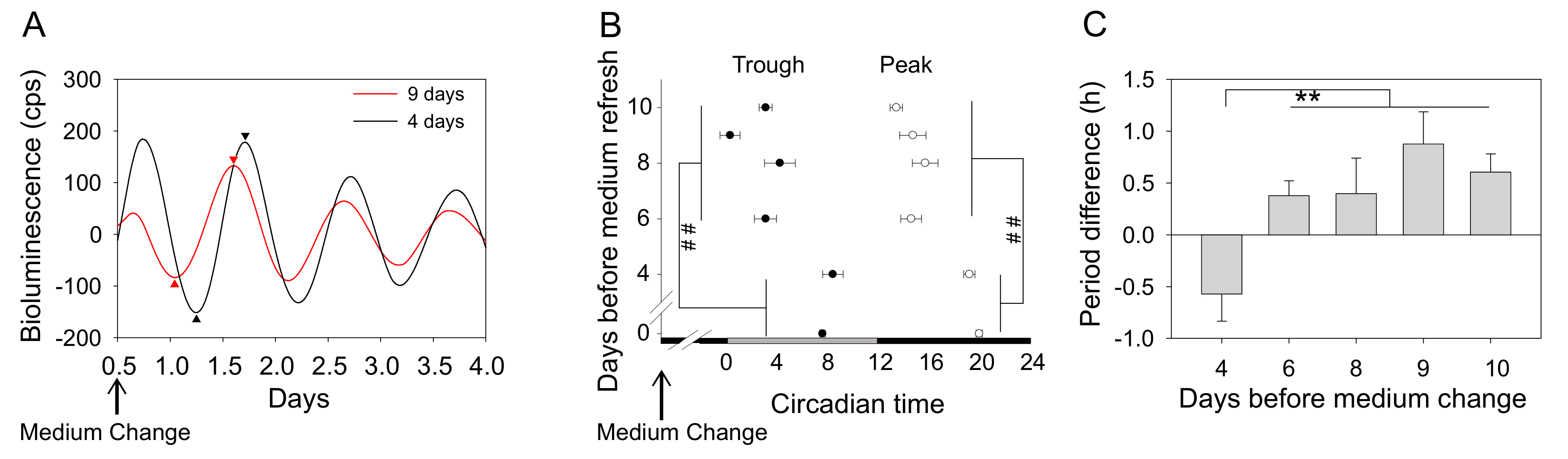 Figure 4. Effect of medium refresh on the phase and endogenous period of PER2::Luc oscillations after 4, 6, 8, 9, and 10 days in culture. A: Representatives curves of PER2::Luc oscillations after changing the medium of the retinal explants after 4 (black line)