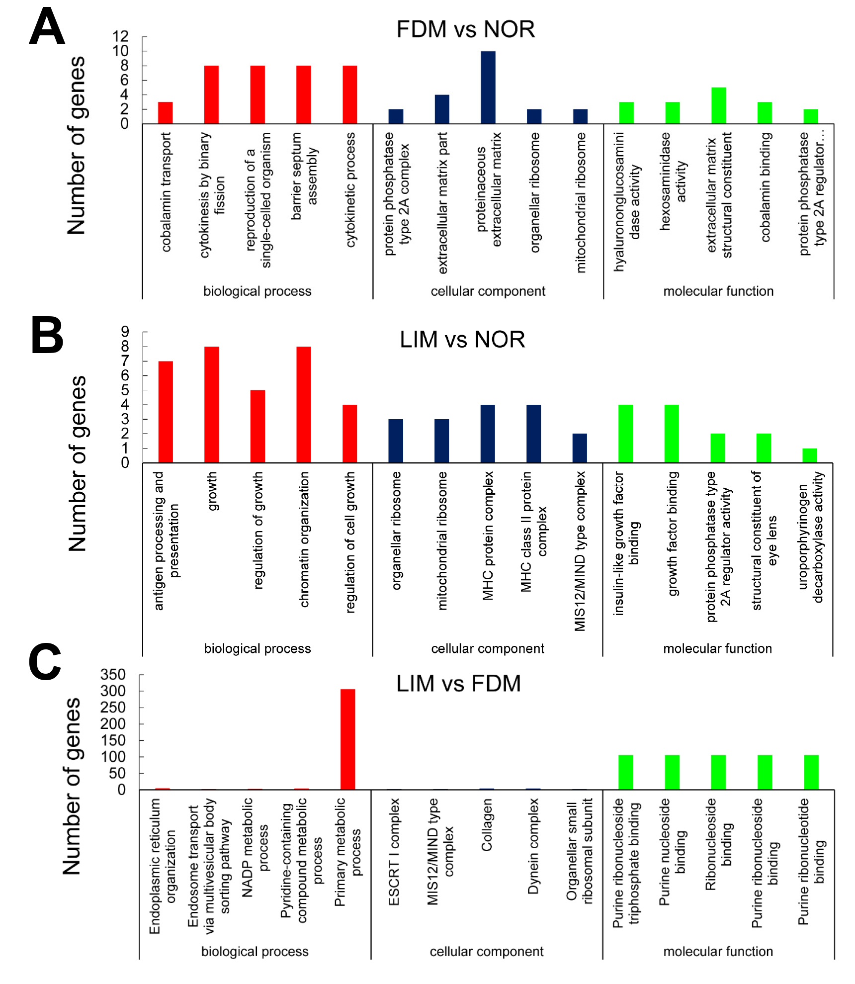 GO analysis. GO enrichment histograms of the target genes of the differentially expressed lncRNAs between the FDM and normal control groups (