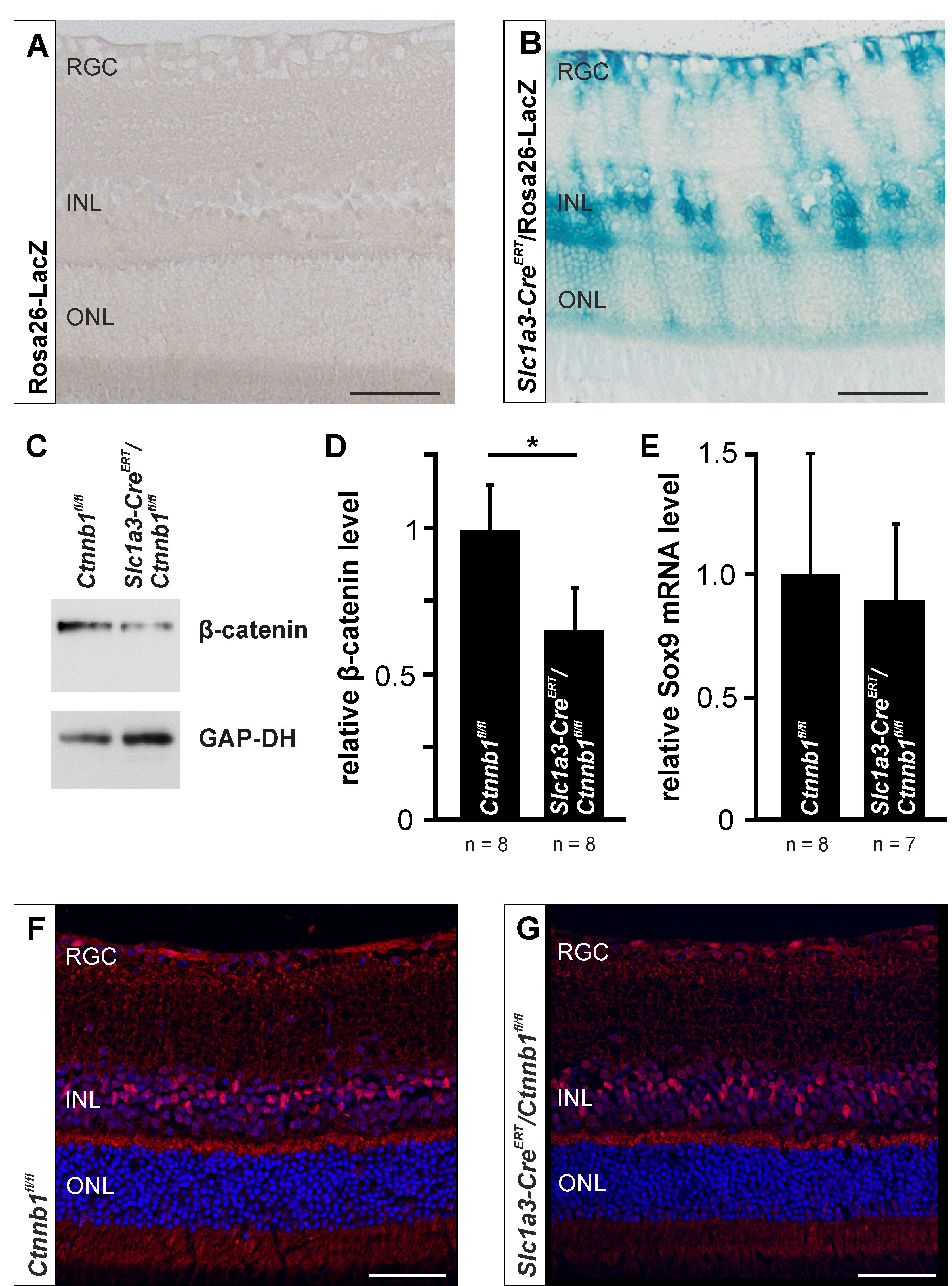 In addition, the nuclei of the labeled cells were localized in the inner nuclear layer (B), whereas no β-galactosidase expression was detected in mice without Cre expression (A). Magnification bars = 50 µm. RGC, retinal ganglion cell, INL, inner nuclear layer; ONL, outer nuclear layer. C, D: Western blot analysis (C) and densitometry (D) for β-catenin from retinal proteins of 8-week-old Slc1a3-CreERT/Ctnnb1fl/fl mice 2 weeks after treatment with tamoxifen (mean ± standard error of the mean, SEM; n = 8; *p<0.05). E–G: Real-time RT–PCR (E) and immunohistochemical staining (F, G) for Sox9 of 8-week-old mice 2 weeks after treatment with tamoxifen (50 µl tamoxifen [20 mg/ml] i.p. 2x/day for 5 days).