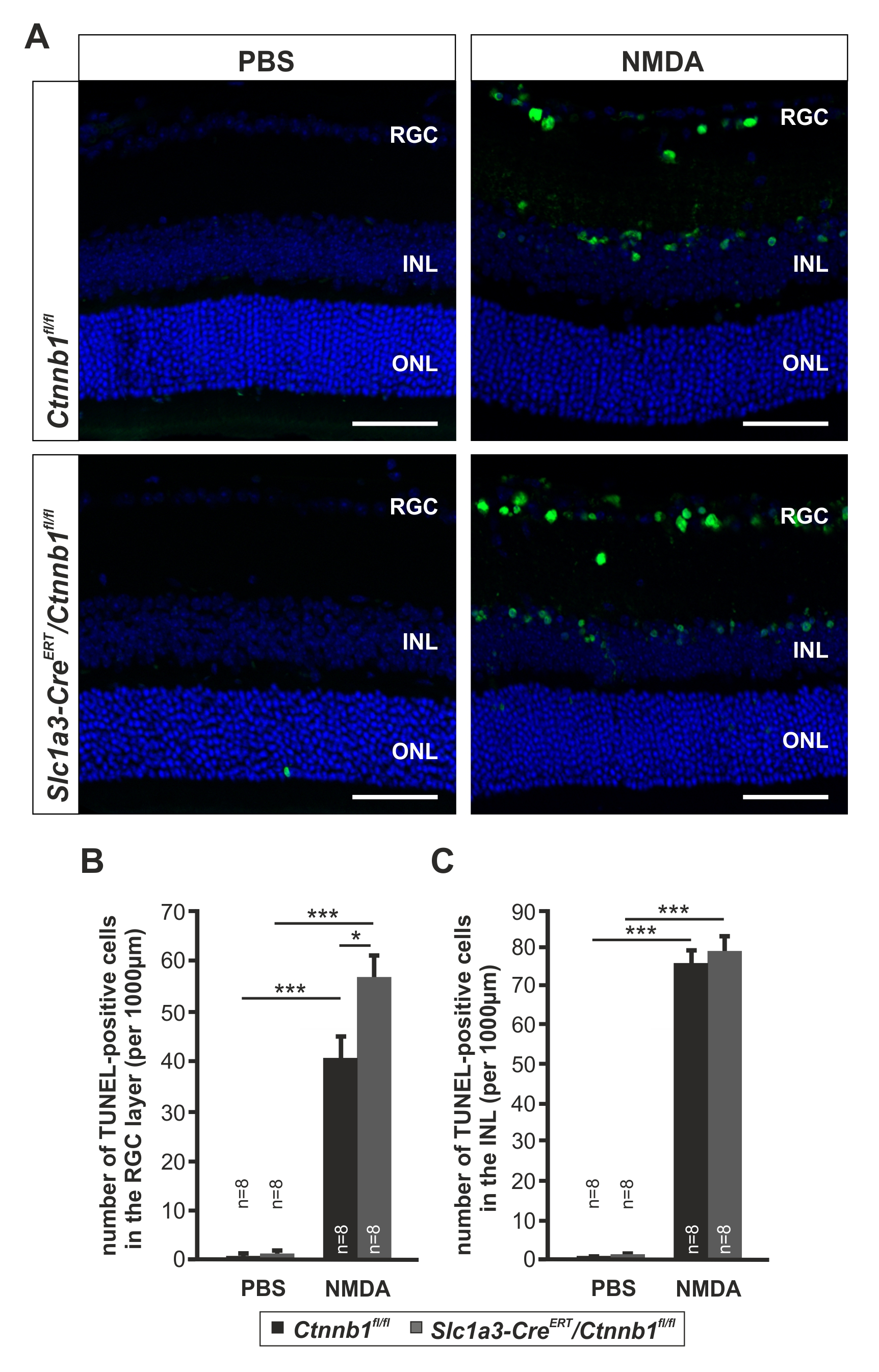 the Slc1a3-CreERT/Ctnnb1fl/fl and Ctnnb1fl/fl animals. Magnification bars, 50 µm; ONL, outer nuclear layer. B, C: The number of TUNEL-positive cells in the RGC layer (B) and the INL (C) was quantified and correlated to the retinal length (mean ± standard error of the mean, SEM; *p<0.05; ***p<0.001).