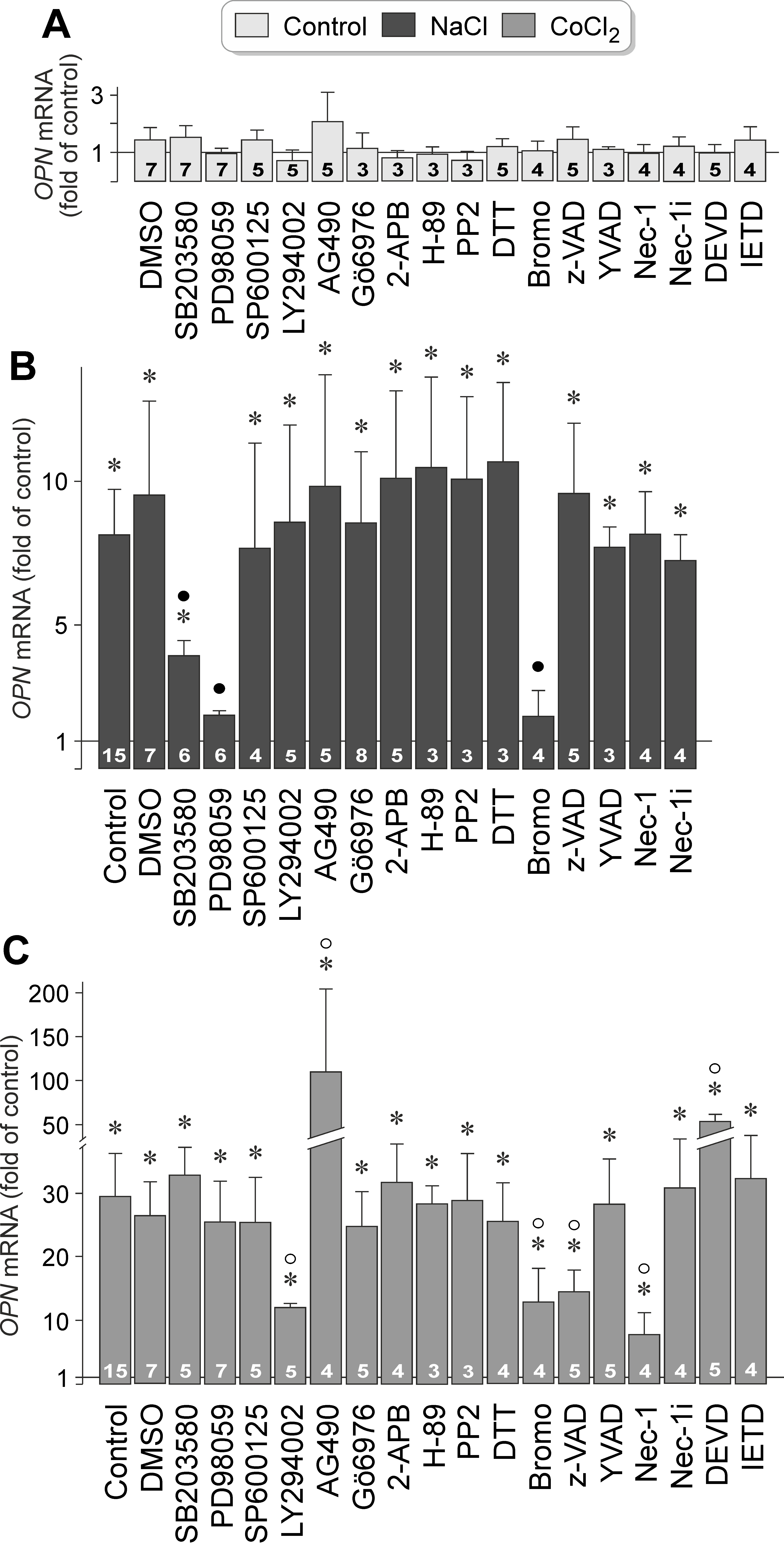 *p<0.05. Statistically significant difference versus NaCl control: ●p<0.05. Statistically significant difference versus CoCl2 control: ○p<0.05.