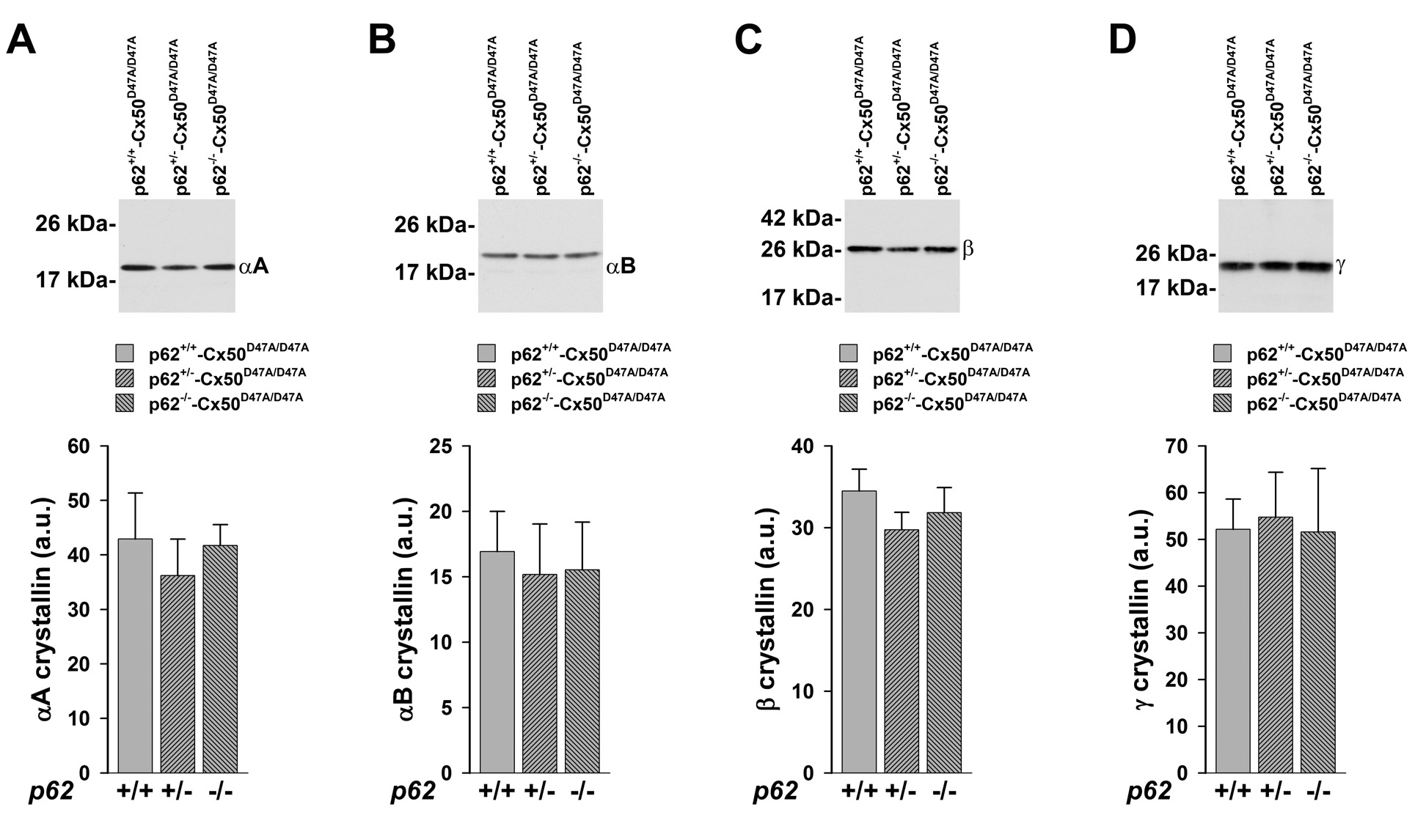 Figure 6. Deletion of p62 does not alter levels of crystallins in homozygous Cx50D47A lenses. A–D: Top panels, immunoblots of αA (A), αB (B), β (C), and γ (D) crystallins in lens homogenates prepared from 1-month-old homozygous Cx50D47A mice that were wild-type for p62 (p62+/+-Cx50D47A/D47A) or heterozygous (p62+/−-Cx50D47A/D47A) or homozygous (p62−/−-Cx50D47A/D47A) p62 null. The migration positions of the molecular mass markers are indicated on the left. Bottom panels, the graphs show the