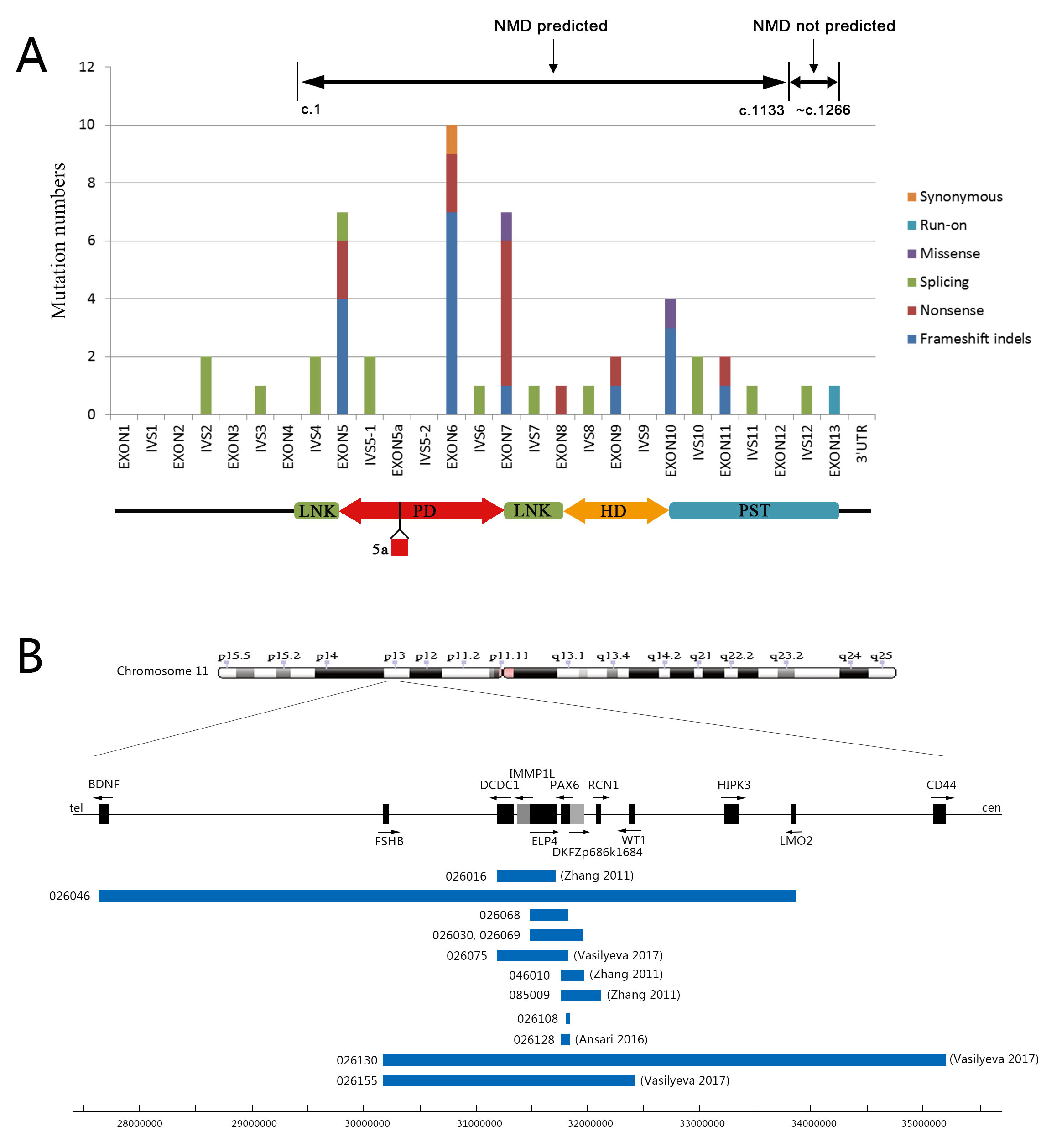 Figure 2. The distribution of 58 distinct mutations in PAX6 detected in the present study. A: The distribution of 47 intragenic mutations on exons and introns of PAX6 and the corresponding domain of PAX6. LNK, HD, PD, and PST indicate the linker region, homeodomain, paired domain, and proline-threonine-serine-rich