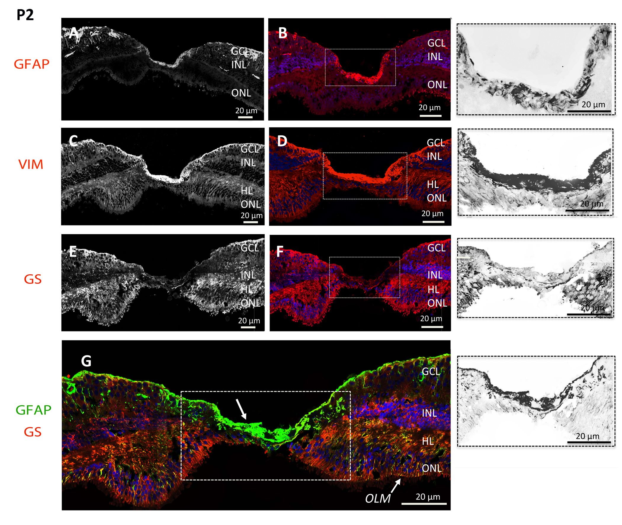 cryosections from P2 with glutamine synthetase (GS), which is a specific marker of Müller cells in humans, glial fibrillar