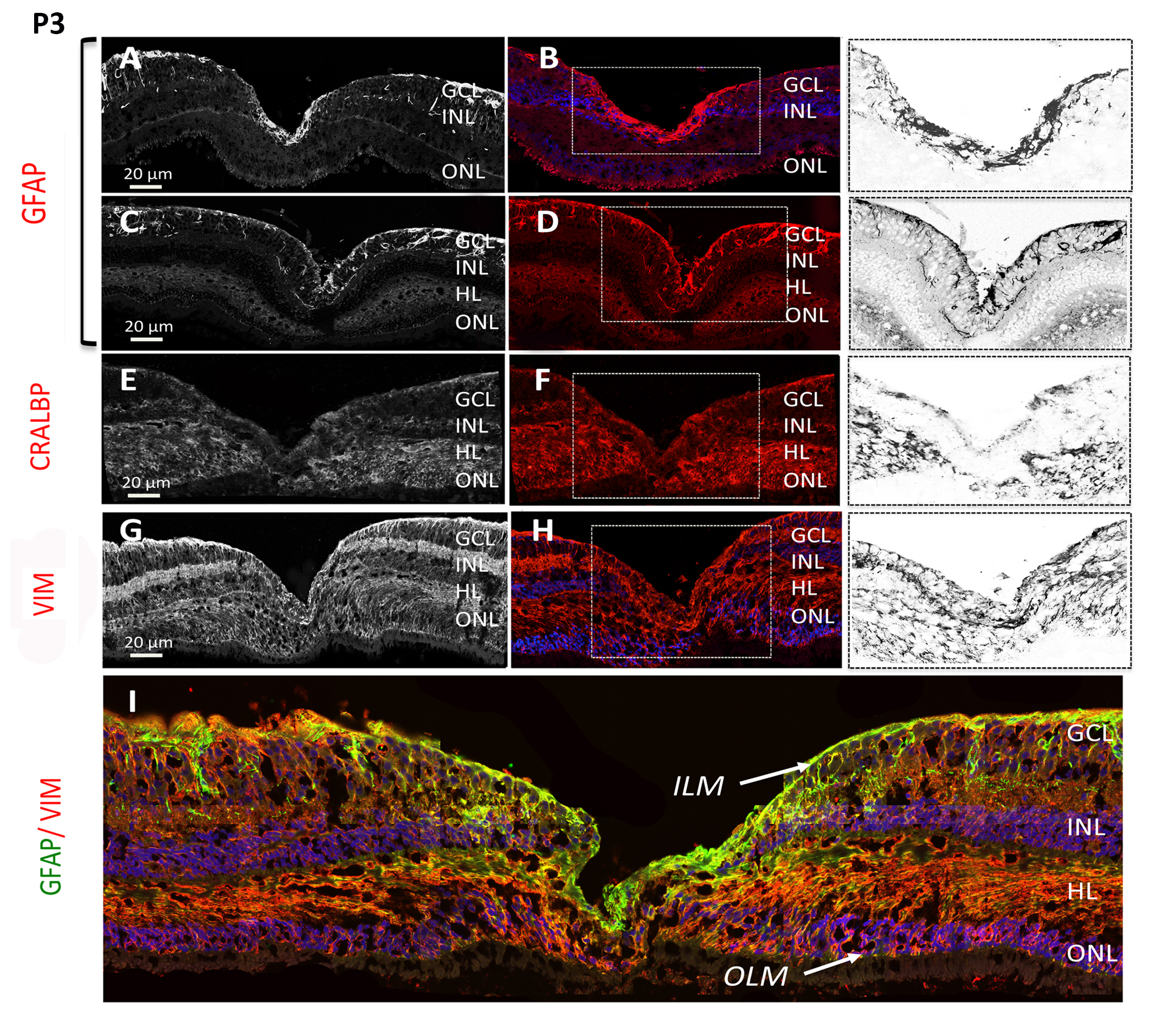 Figure 4. Coimmunostaining of P3 foveal glial cells with the Müller cell marker CRALBP, GFAP, and vimentin. Coimmunostaining of foveal