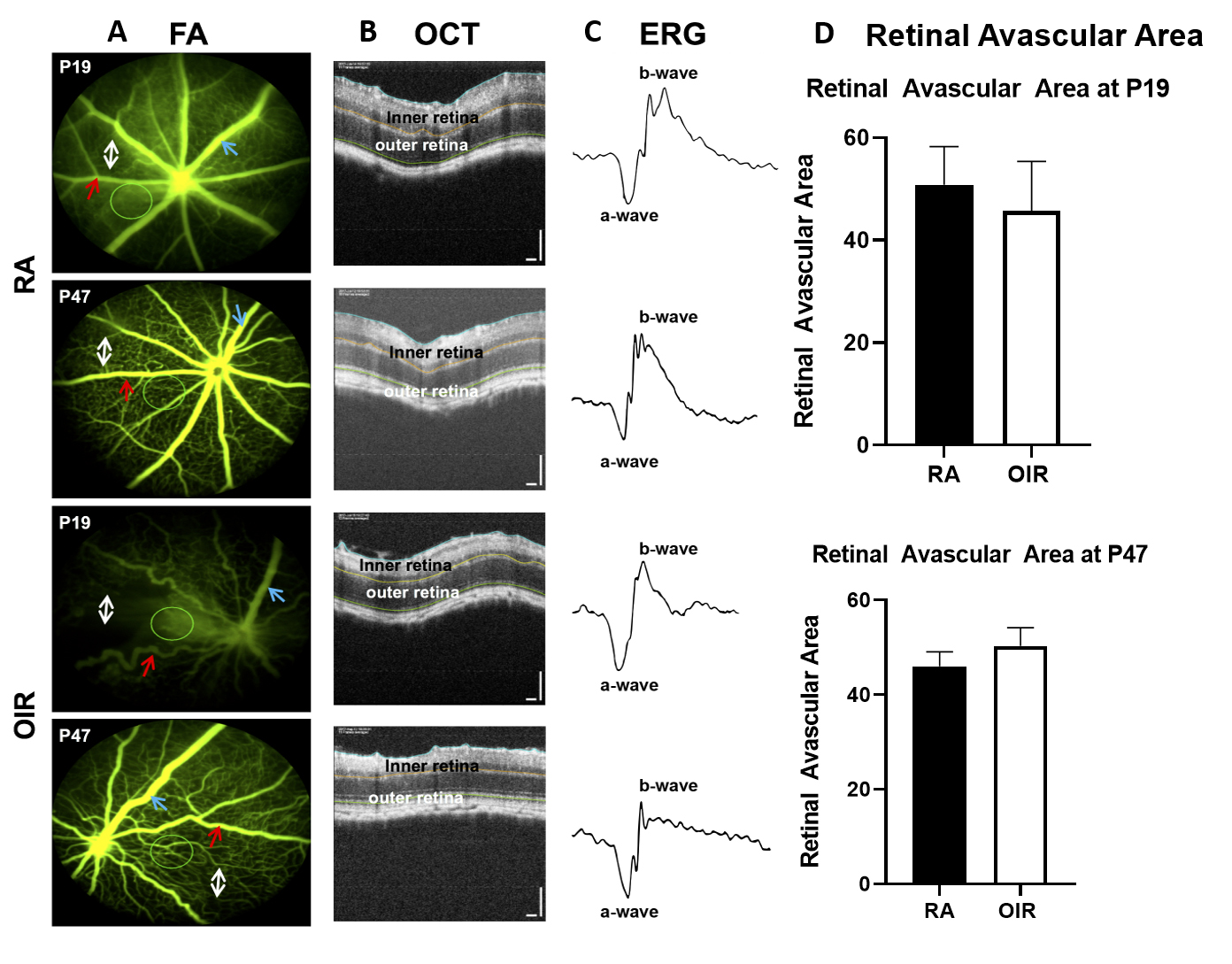 C: Representative ERGs at P19 and P47 in the RA and OIR mice. The ERG shows a decrease in the b-wave amplitude at P47 in the