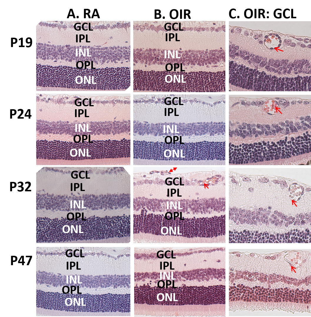 Figure 2. Retinal thickness analysis at P19, P24, P32, and P47 in RA and OIR mice. A: H&E cross sections of retinas of the RA mice. Histology shows normal architecture at P19 and P47. B: Retinal cross section of the OIR mice. Histology shows neovascularization (red arrow) at P1, inner retinal thinning, and