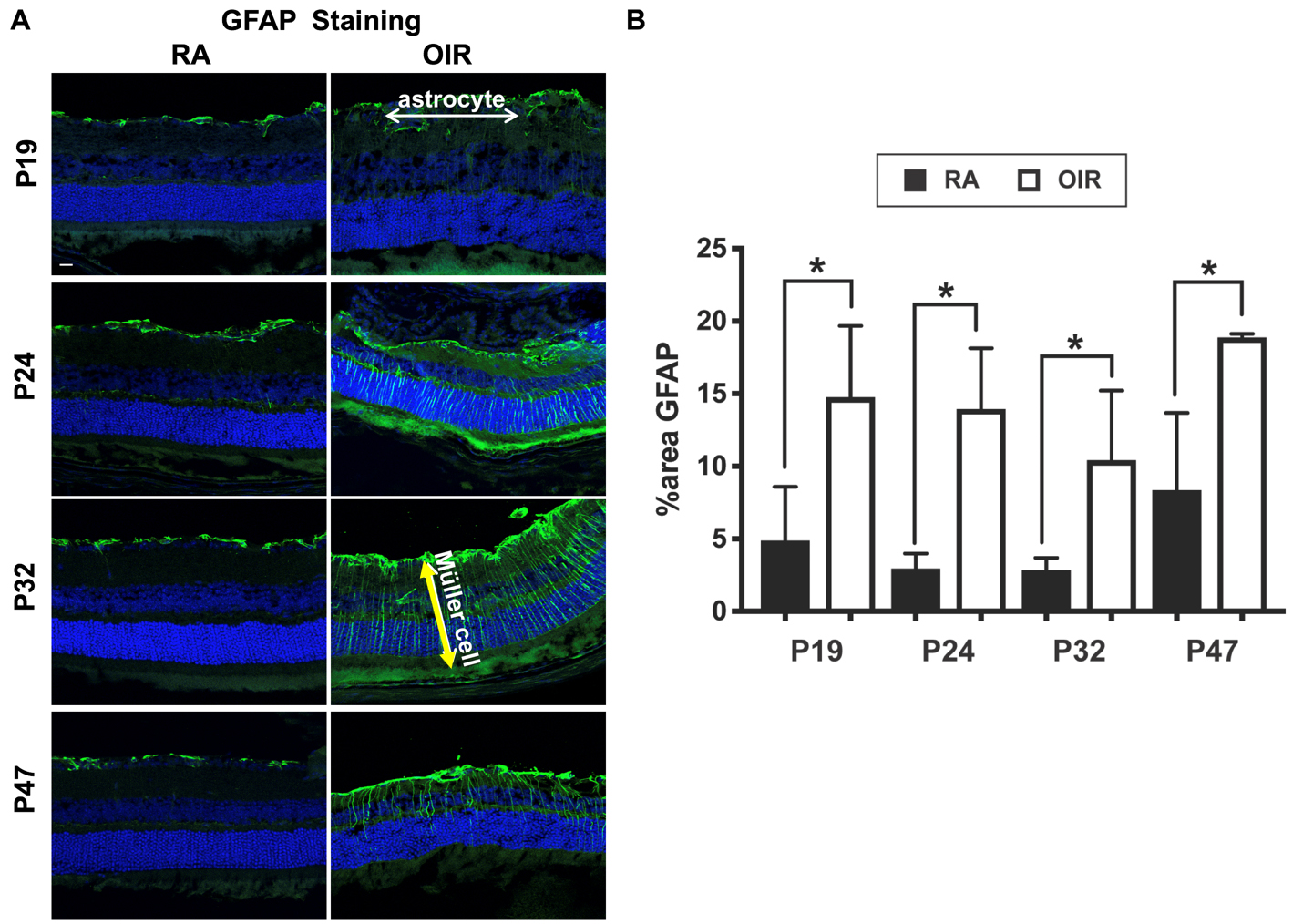 shows Müller cell location spanning the entire retinal cross section. C: Quantification of GFAP expression in RA and OIR mice with increasing developmental age. RA = room air; OIR = oxygen-induced