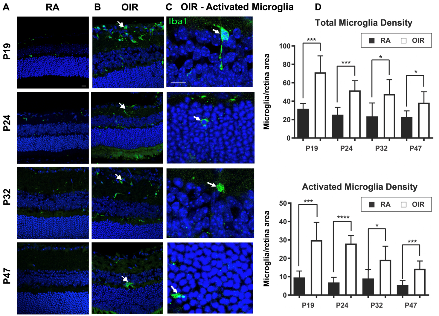 Figure 6. Activated microglia activity at P19, P24, P32, and P47 in RA and OIR mice. A: Iba1 staining in the retinas of the RA mice. B: The white arrow denotes activated microglia. C: Activated microglia in OIR mice (magnified view from each age in B). D: Quantification of total microglial cells and activated microglial cell densities. Three RA mice and three OIR mice were