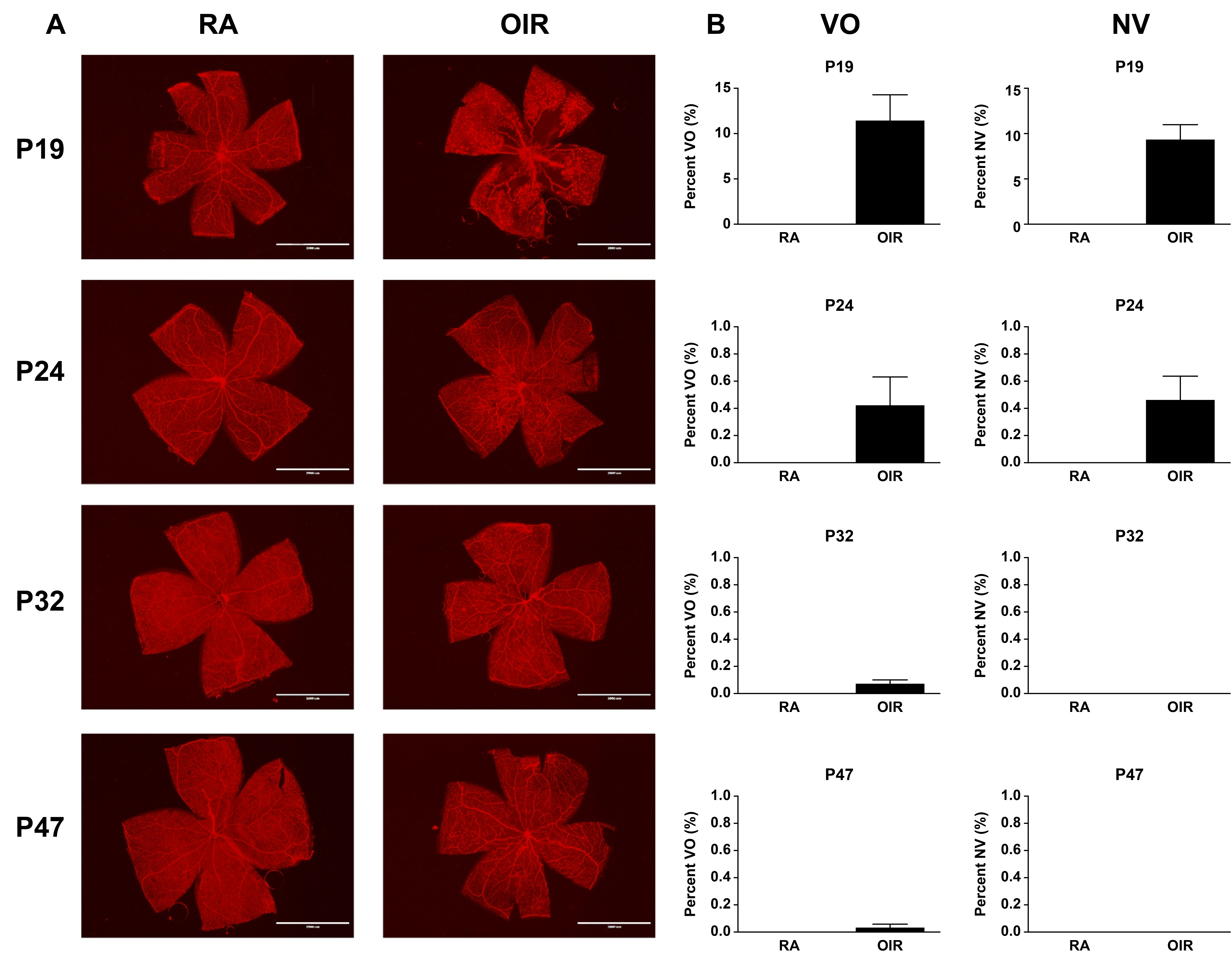 retinopathy; P = postnatal day age; VO = vaso-obliteration; NV = neovascularization. At P19, four RA mice and four OIR mice