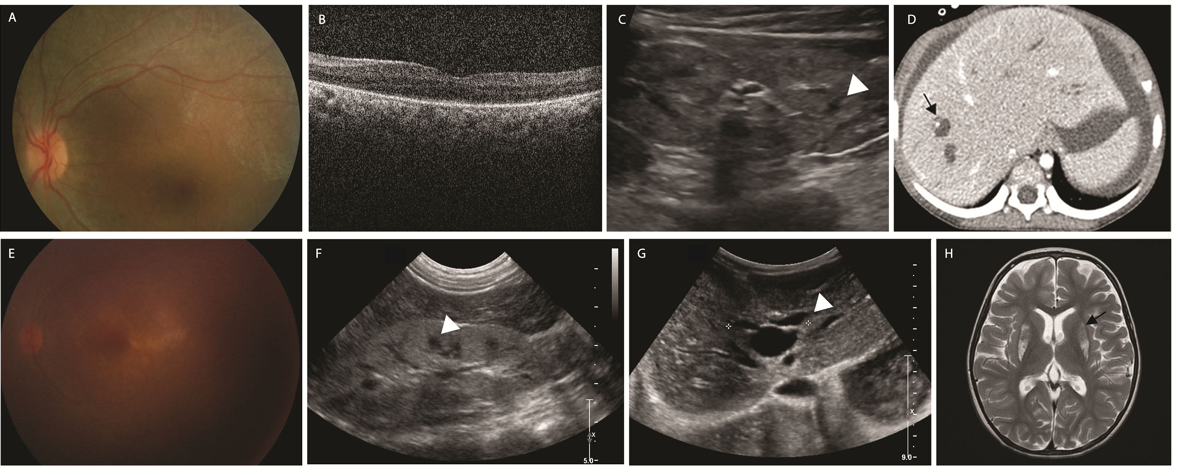 were noted. She was neurologically normal. E–H: Fundus photograph, renal and abdominal ultrasonography, and brain magnetic resonance imaging (MRI) image of a 4-year-old