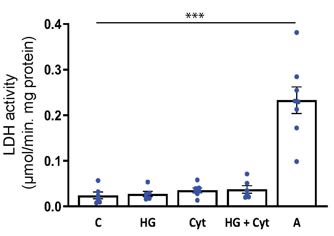 ***p<0.001. Abbreviations: A, anoxia; C, control; Cyt, proinflammatory cytokines; HG, high glucose; HG + Cyt, high glucose