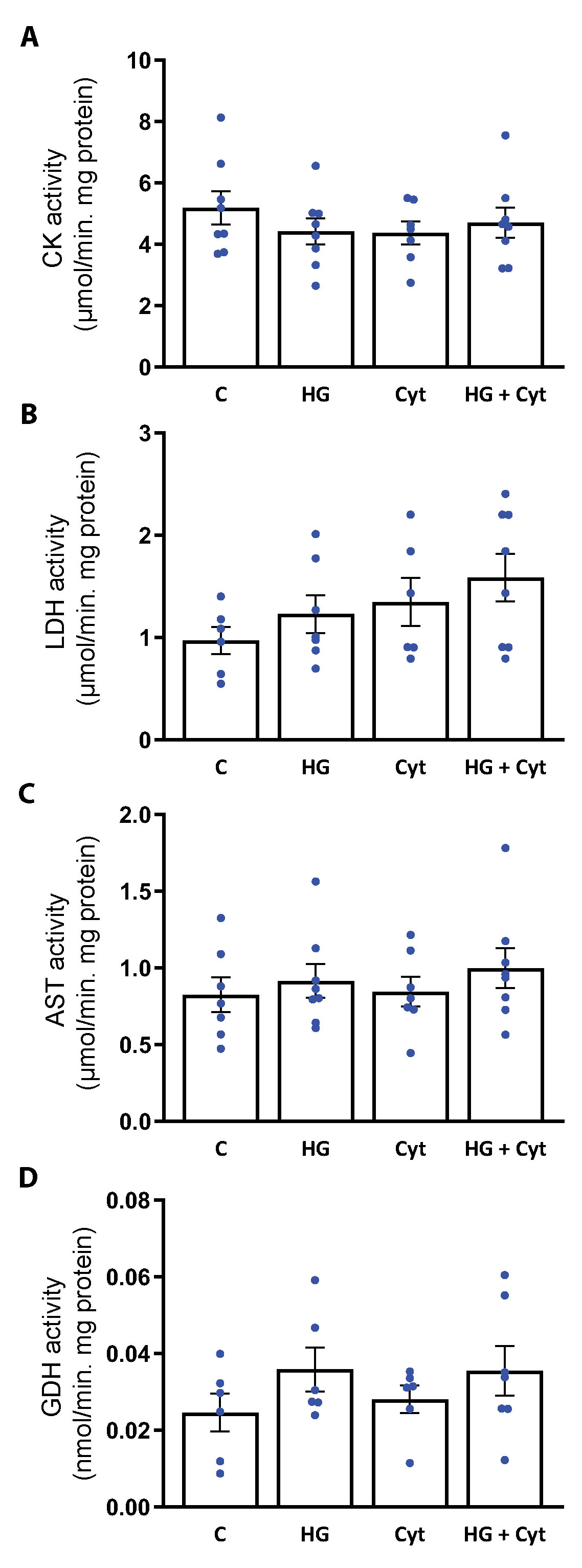 mean ± standard error of the mean (n = 6–8 for each group). Abbreviations: C, control; Cyt, proinflammatory cytokines; HG,
