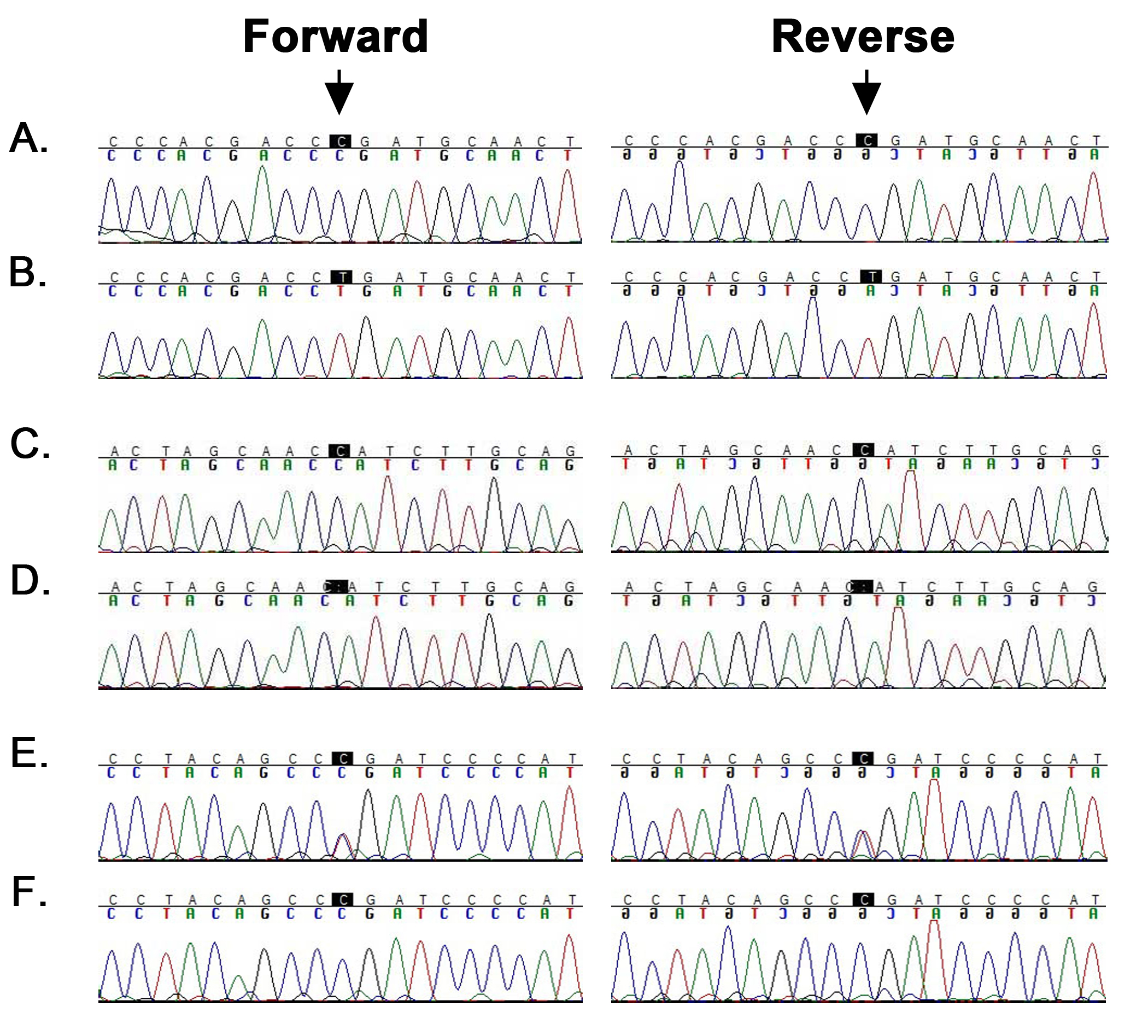 Figure 2. Bidirectional Sanger sequencing identified mutations in FYCO1 in chromosome 3p21-linked pedigrees. A, B: Forward and reverse sequence chromatograms of individual 18 (unaffected) harboring the wild-type allele and individual 11