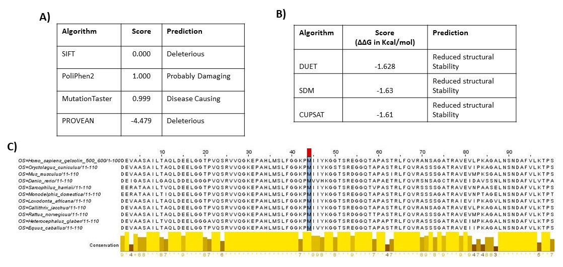 MutationTaster, and Protein Variation Effect Analyzer (PROVEAN) algorithms. B: In silico prediction of the effects on the protein stability produced by the p.Met544Arg replacement on GSN. Algorithm predictions