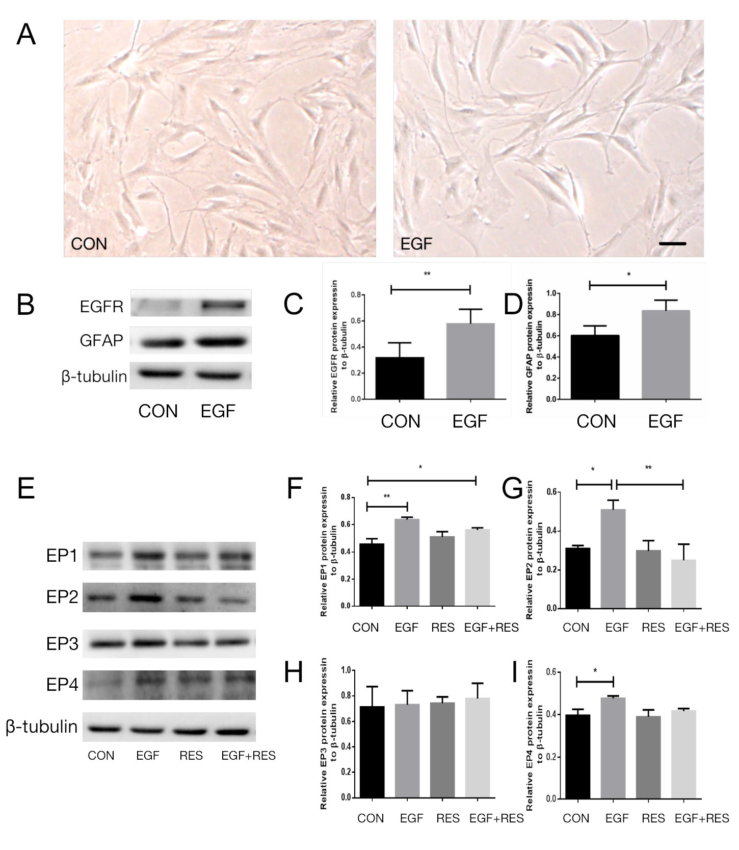 EGFR and GFAP antibodies for immunoblotting. E- I: The expression level of EP1–4 was evaluated with western blotting. β-tubulin was used as a loading control in all samples.