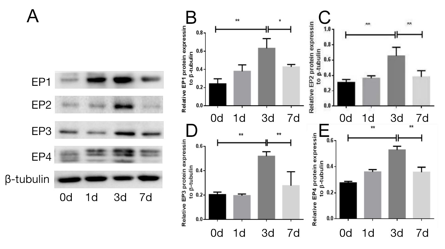 Figure 3. The PGE2 receptor is involved in I/R injury. A-E: Ischemia-reperfusion (I/R) injury markedly upregulated the expression of EP1-4 at day 3, and β-tubulin was used as a loading