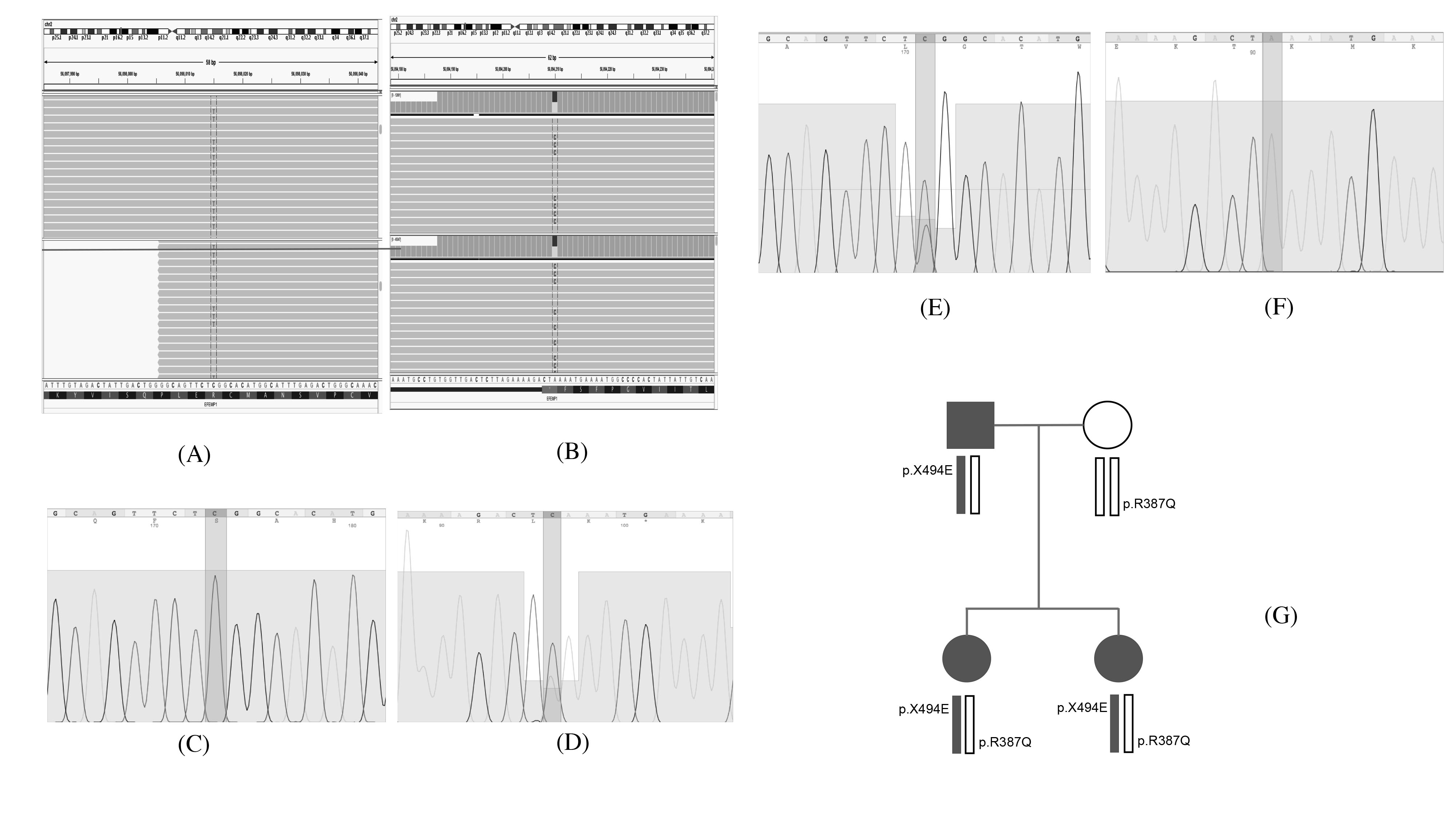 C, D: p.Arg387Gln and p.Ter494Glu for the father of the siblings, respectively. E, F: p.Arg387Gln and stop signal for the mother of the siblings, respectively. G: The pedigree map for the family with mutations in EFEMP1.