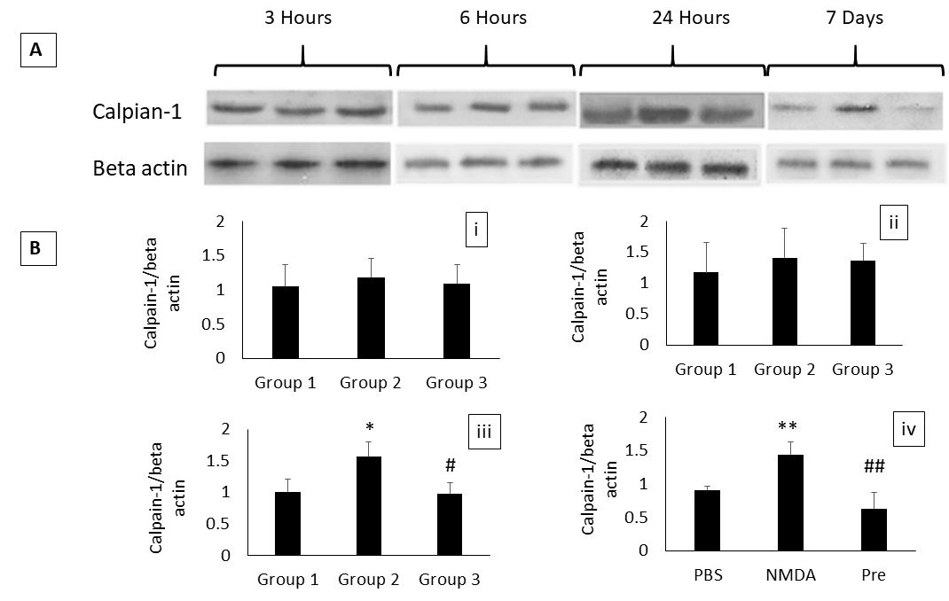 Figure 5. Effect of MgAT pre-treatment on NMDA-induced changes in the retinal calpain-1 expression. A: Calpain-1 and β actin bands obtained from Western blot at 3-, 6-, 24-h and 7 days post-treatment. B: The densitometric analysis of Western blot bands (i) 3 h after treatment (ii) 6 h after treatment (iii) 24 h after treatment