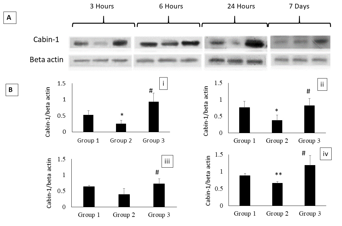 Figure 6. Effect of MgAT pre-treatment on NMDA-induced changes in the retinal cabin-1 expression. A: Cabin-1 and β actin bands obtained from Western blot at 3-, 6-, 24-h and 7 days post-treatment. B: The densitometric analysis of Western blot bands (i) 3 h after treatment (ii) 6 h after treatment (iii) 24 h after treatment