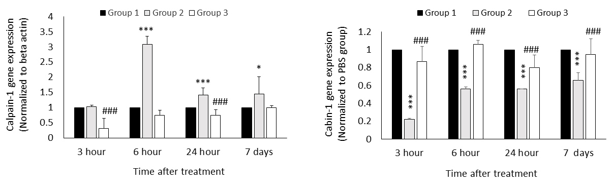 Figure 8. Effect of MgAT on NMDA-induced changes in retinal gene expression of (A) calpain-1 (B) cabin-1 at 3-, 6-, 24-h and 7 days post-treatment. Group 1 was injected with PBS, group 2 was injected with NMDA and group