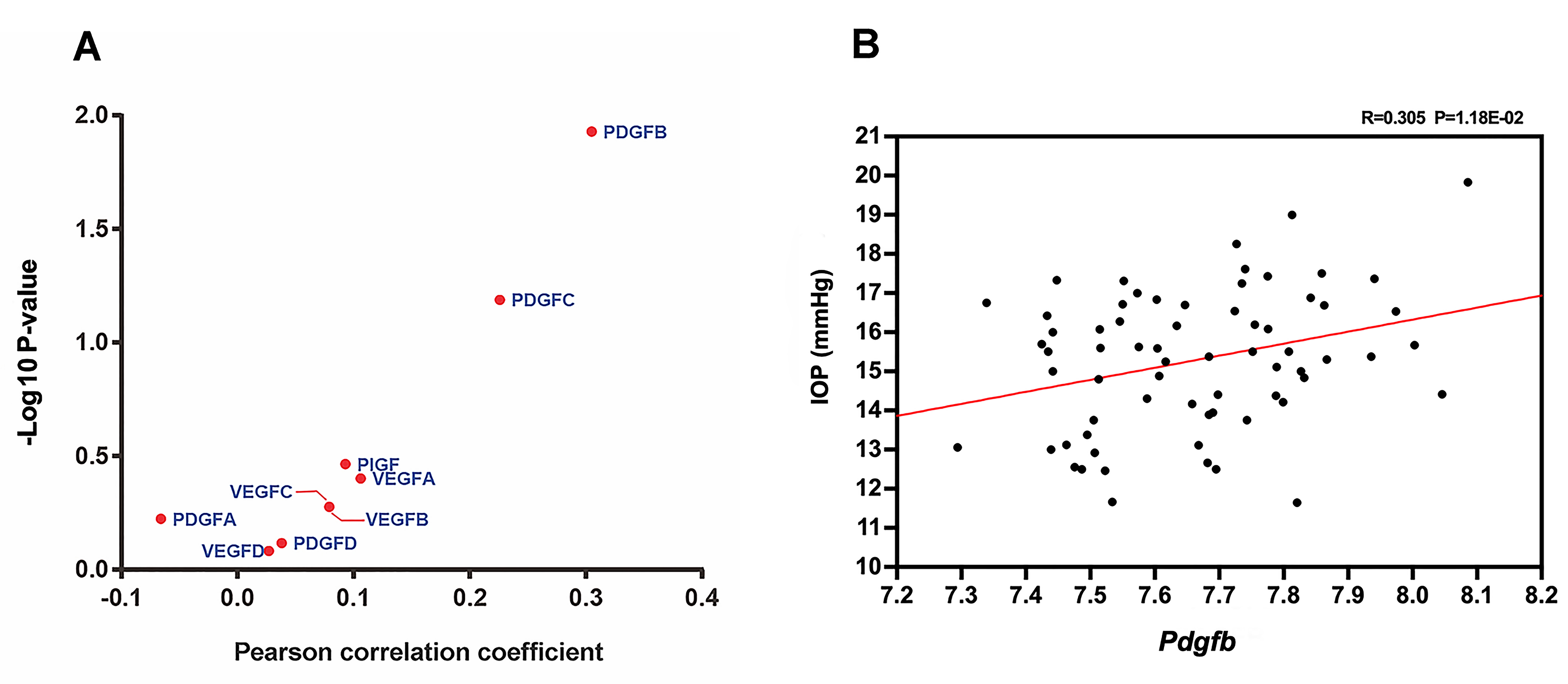 Figure 1. Expression of Pdgfb correlated with intraocular pressure (IOP). A: A volcano plot was created for Pearson correlations between IOP and members of the platelet-derived growth factor (PDGF)