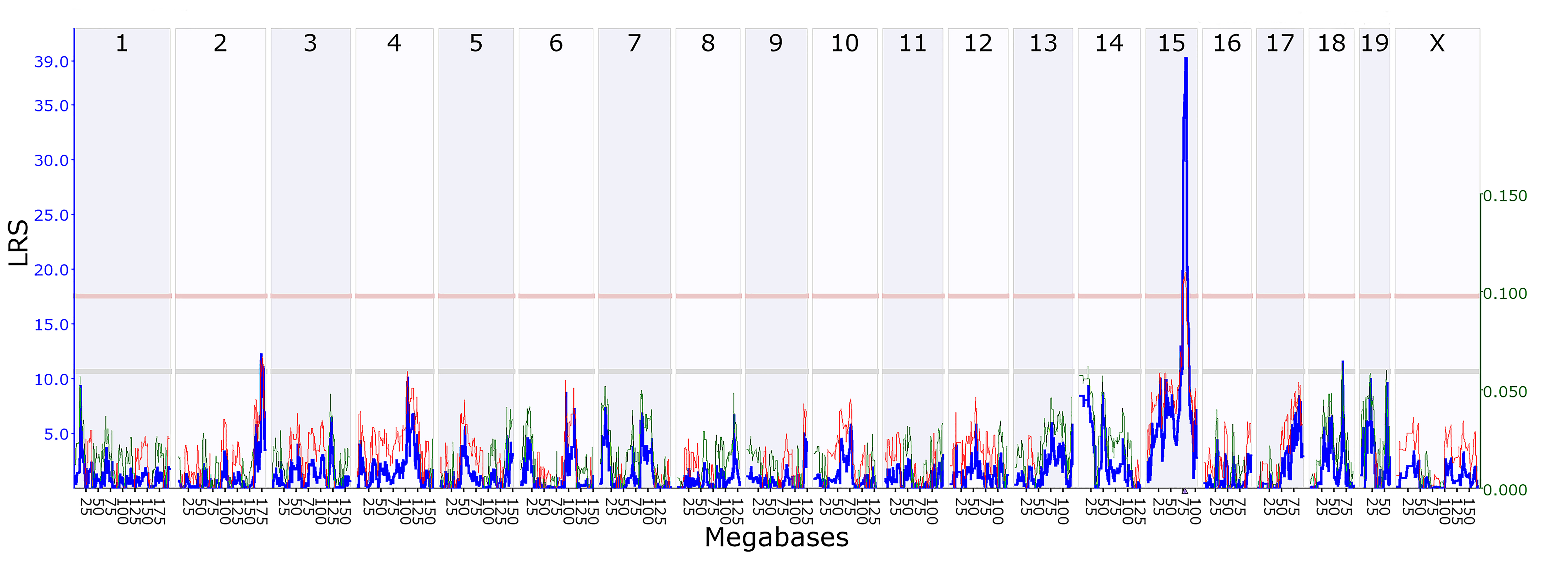 a likelihood ratio statistics (LRS) score in blue, and the right y-axis provided an additive effect. The red and green lines