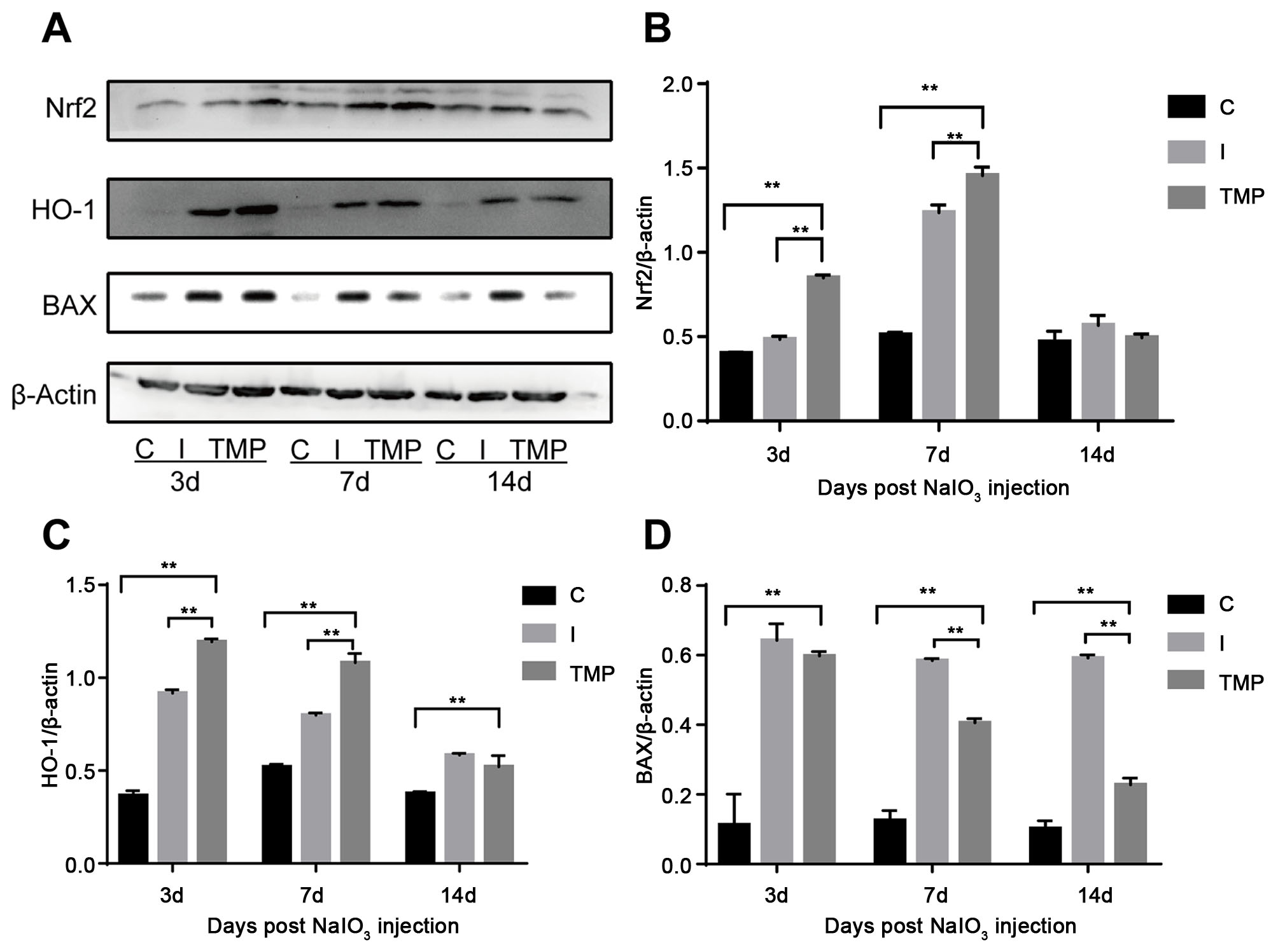 7 post-NaIO3 injection. D: BAX expression levels increased by approximately sixfold in the TMP group and Group I at day 3 day post-NaIO3 injection when compared with the control group. It decreased gradually in the TMP group in the following days but remained